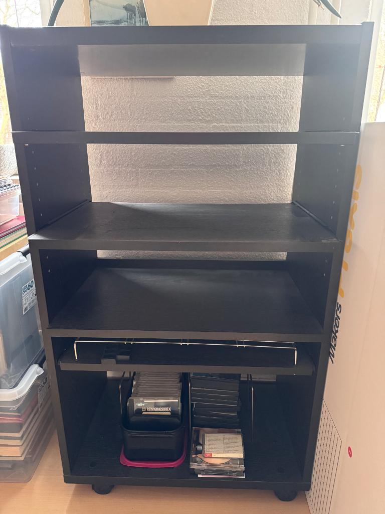Zwart wengé audiomeubel met ruimte voor vinylplaten. Er zitten 2 vlakke uitschuifplanken in en 1 uitschuifplank met rekje voor cassette bandjes. Maten 110 x 65 x 43 in goede staat.