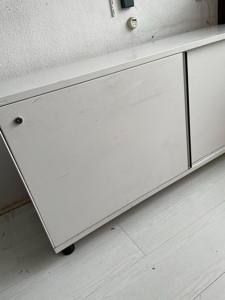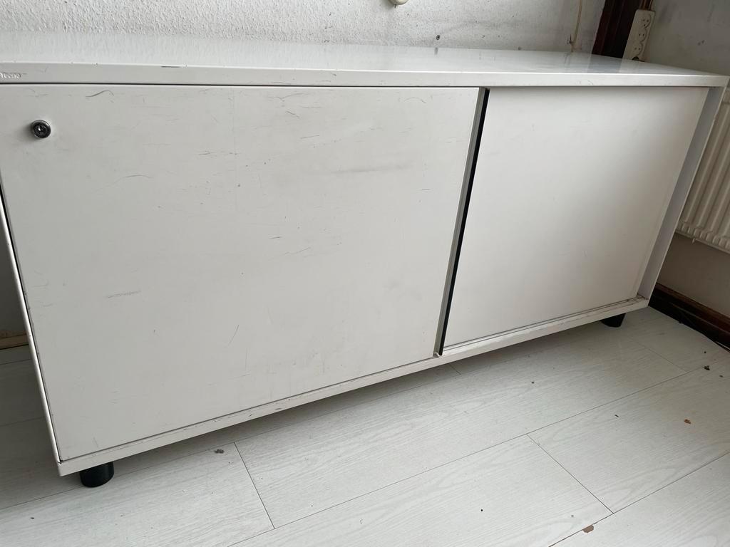Witte metalen kast met schuifdeuren en een legplank. De kast is in goede staat, maar heeft wel wat gebruikssporen. Ideaal voor kantoor of thuis. Maten hoogte 74 cm diepte 47 cm lengte 1,60 m de kast s