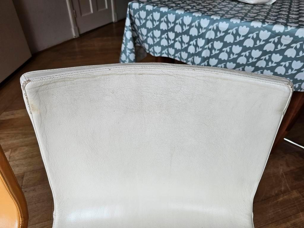 Set van 6 ikea bernard lederen eetkamerstoelen. Bestaande uit 4 witte en 2 oranje stoelen. De stoelen zijn goed gebruikt. Daarom gratis.