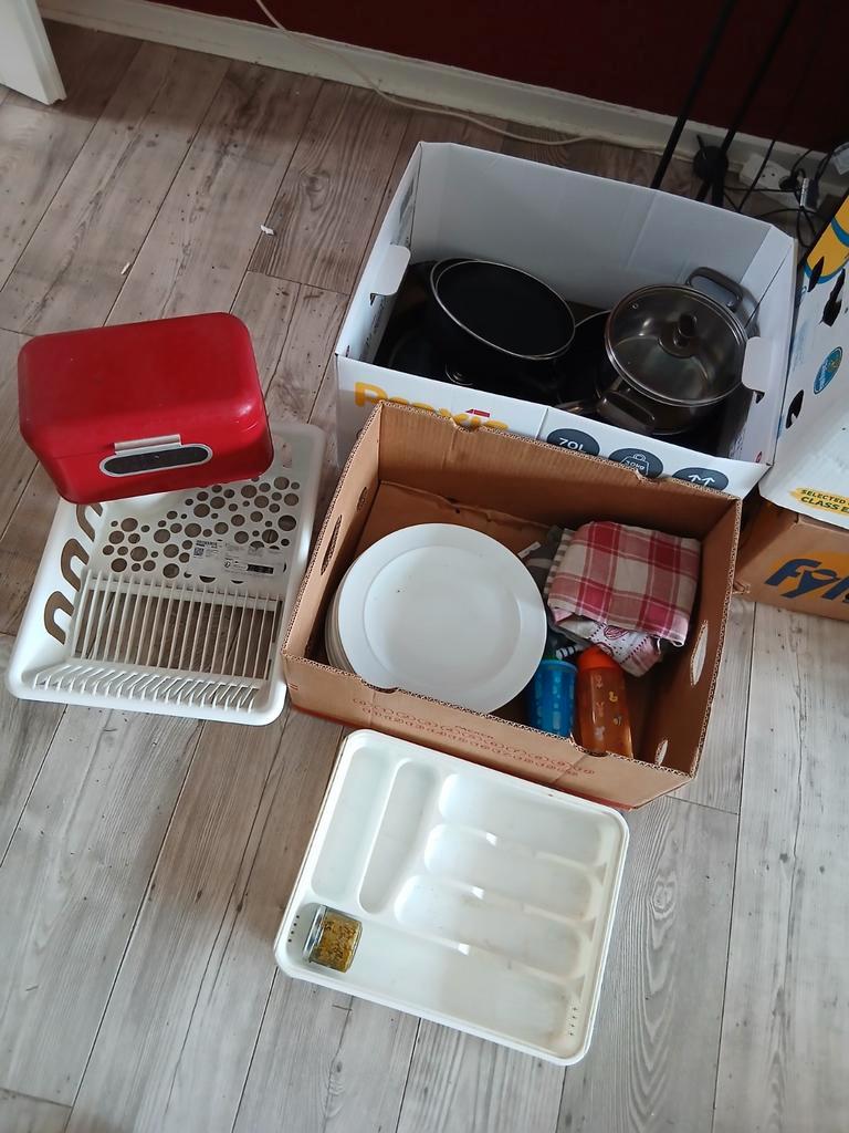 Diverse keukenbenodigdheden, waaronder pannen, borden, bestekbak, afdruiprek en broodtrommel. Alles in gebruikte staat. Het moet even goed schoongemaakt worden wegens verbouwing.
