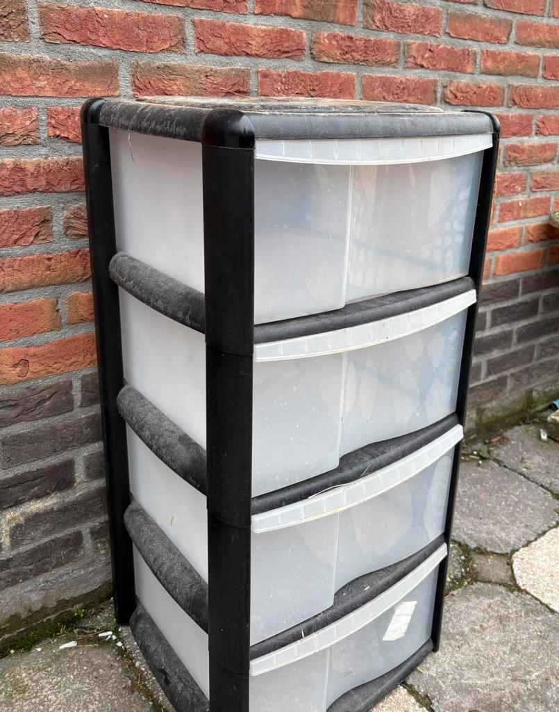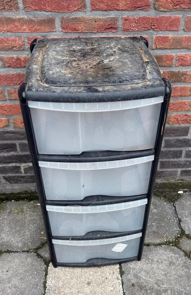 Ladekastje met vier lades. Nog helemaal goed maar moet wel even schoongemaakt worden. Ongeveer 40 x 40 cm. Hoogte 90 cm?