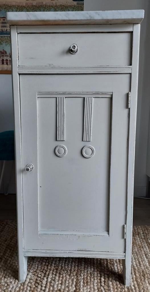 Retro kastje, waarschijnlijk met originele en aangepaste elementen. Met lade en 2 vakken. 37 Breed, 34 diep, 81 cm. Hoog. Marmeren plaatje ligt er los op, 37 bij 39cm. Vanwege verhuizing en nieuwe inr