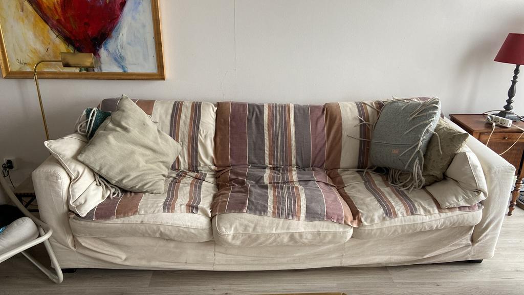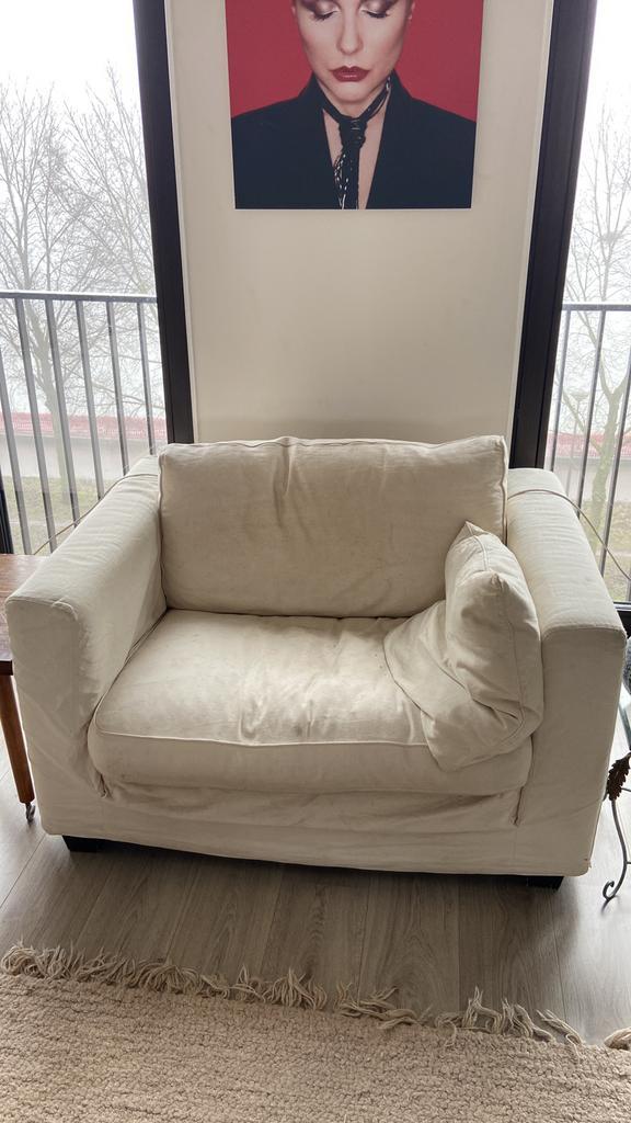 Hele fijne linteloo bank met loveseat. Beide hebben aandacht nodig, maar kunnen zeker nog een ronde mee. Er zitten bijvoorbeeld enkele gaten langs de naden, twee risten zijn kapot en de stof heeft vee