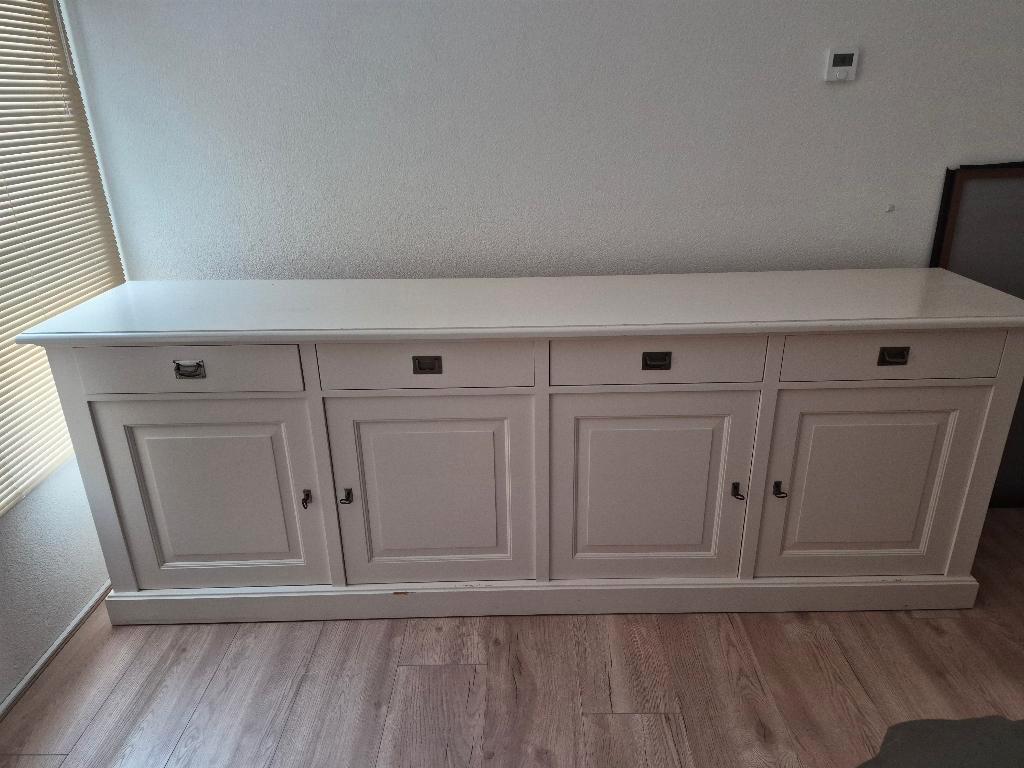 Massief houten, wit dressoir, lang 2.57 X breed 55 x hoog 91. Kan niet via de lift, is te lang. Met de trap vanaf de 1e etage of via de afrit van het parkeerdek. Gratis afhalen vandaag. Moet weg ander