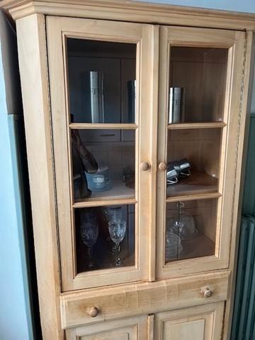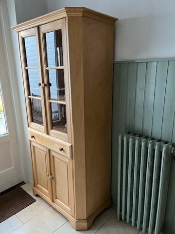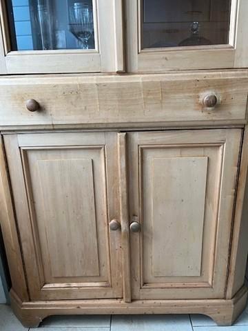Grenen keukenkast (blank, dus ongelakt). Afmetingen: hoogte is 187 cm breedte is 97 cm diepte is 50 cm de 2 legplanken in het bovenste gedeelte van de kast zijn 38 cm diep.