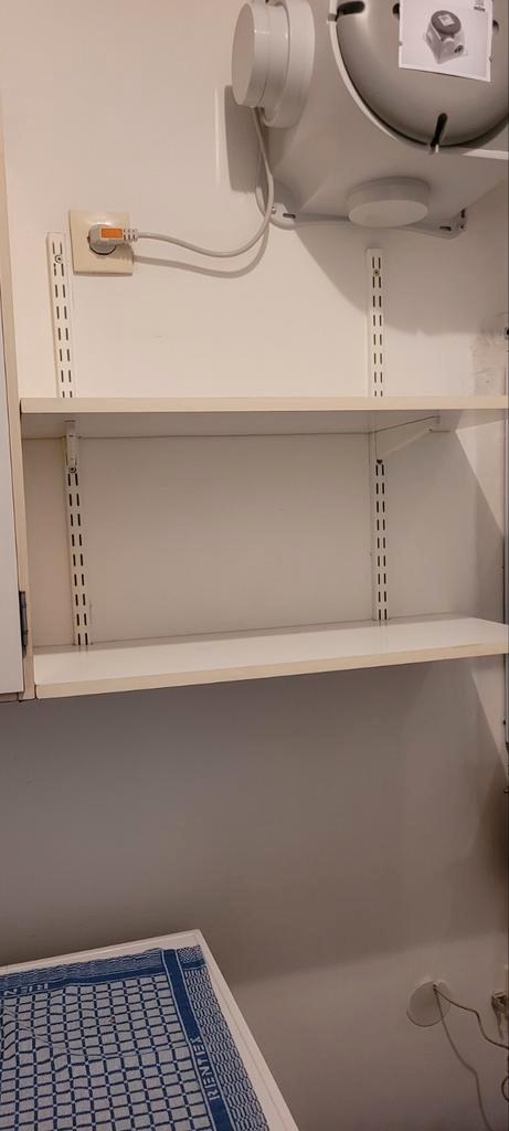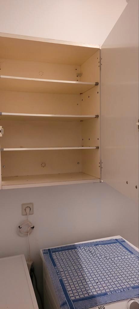 Twee eenvoudige kastjes, handig voor in de schuur / garage. Maat per kastje 60 cm breed 75 hoog 32 diep ernaast 2 planken met bevestiging voor aan de muur.