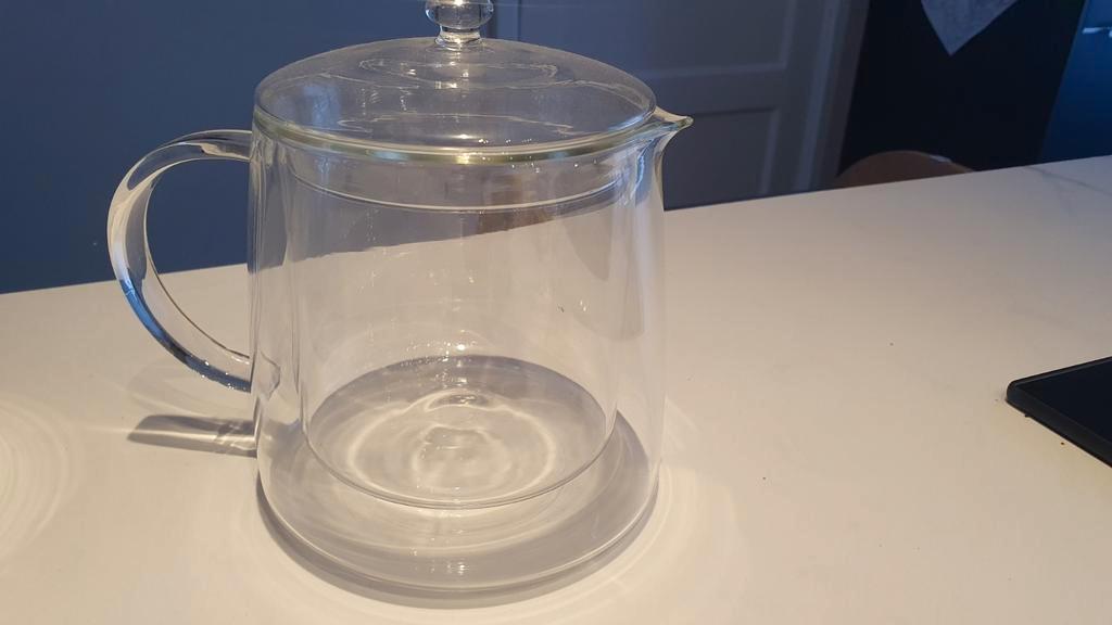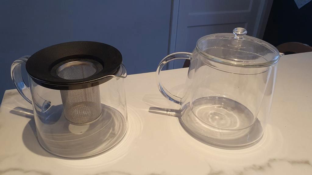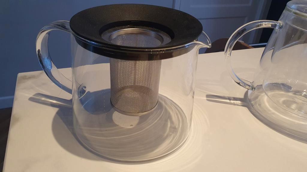 Set van twee glazen theepotten. Een theepot met een filter voor losse thee (dekseltje ontbreekt) en een dubbelwandige theepot met deksel. Beide theepotten zijn weinig gebruikt en in goede staat. Allee