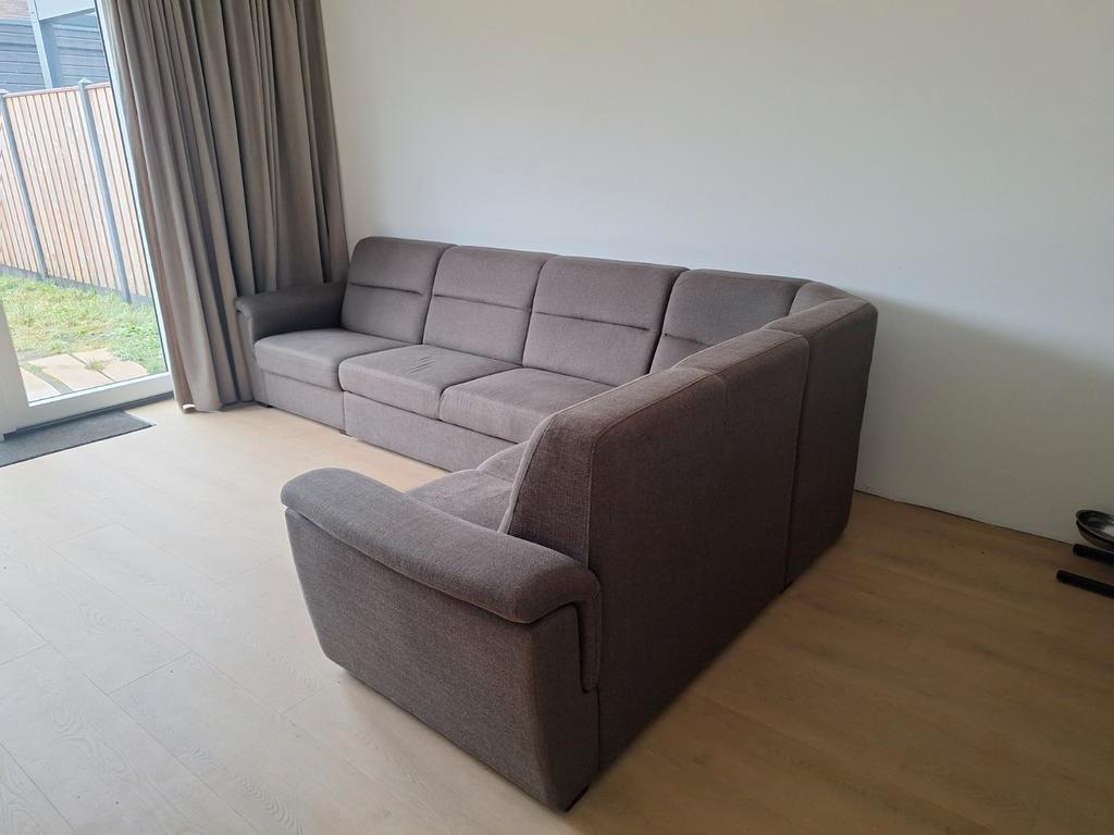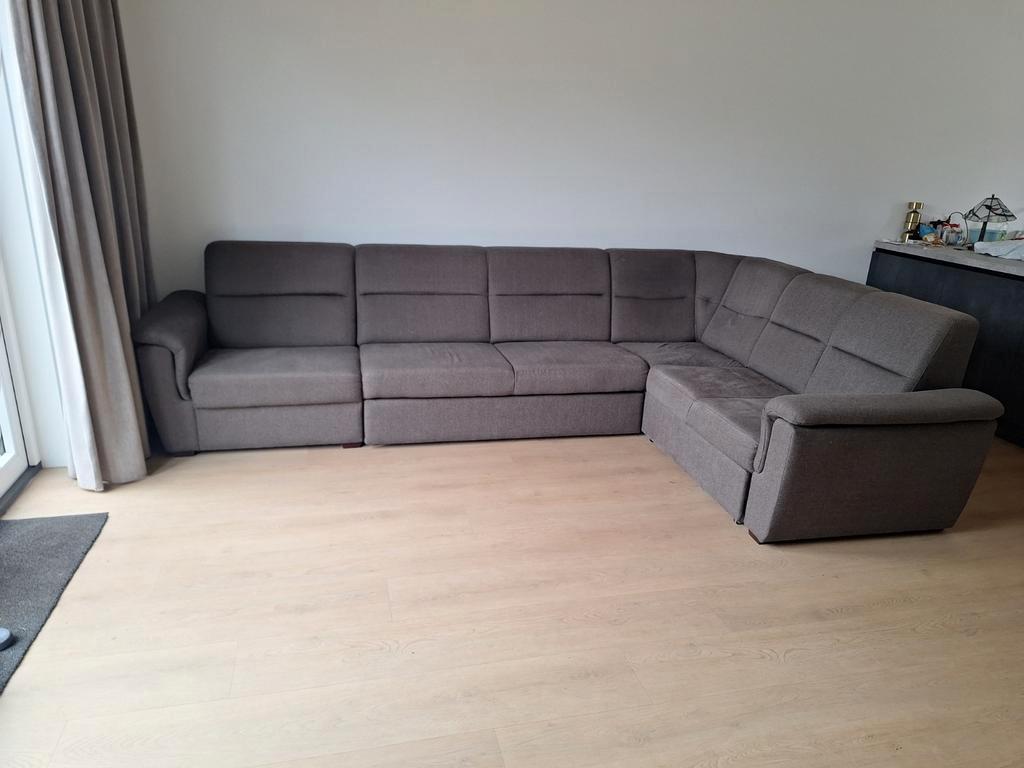 Hoekbank met slaap funktie. Opberglade maten (ongeveer): 340 cm lange zijde 215 cm korte zijde 90 cm diepte 90 cm hoog slijtage in de hoek(zie foto) gaat weg omdat deze in mijn nieuwe huis iets te gro