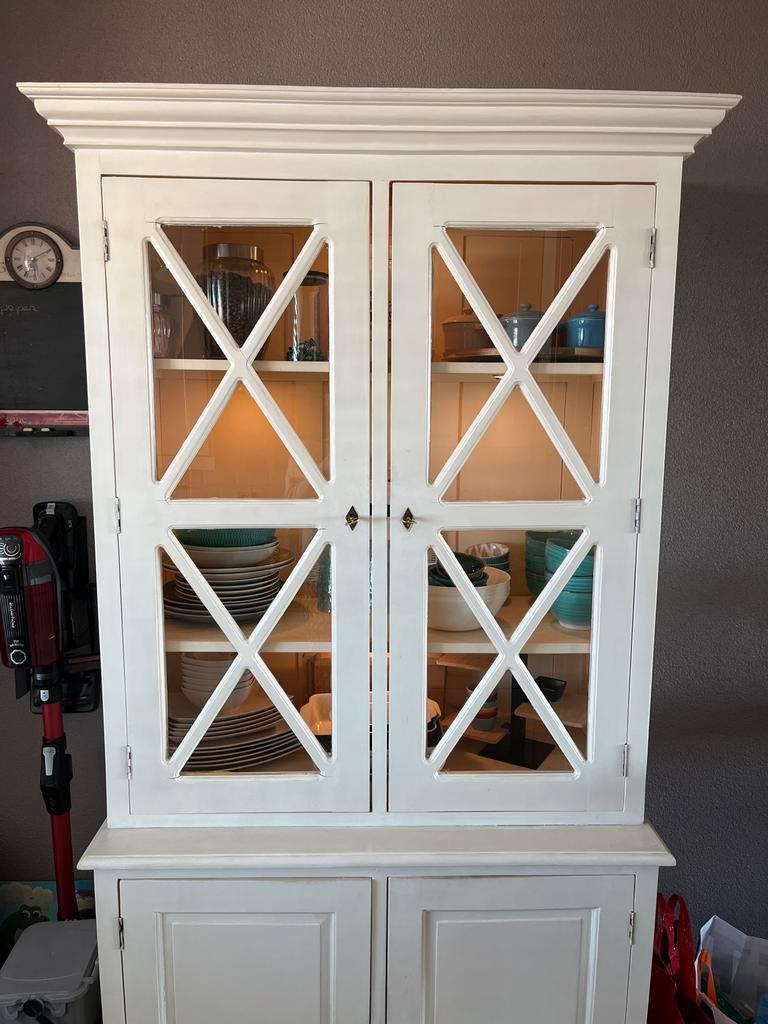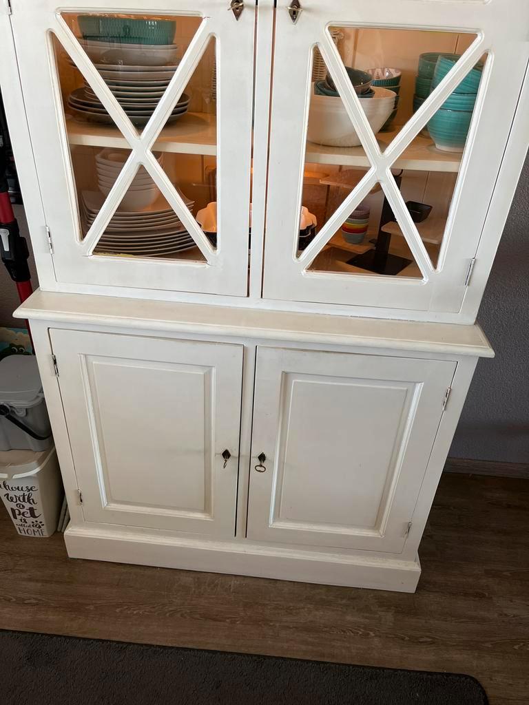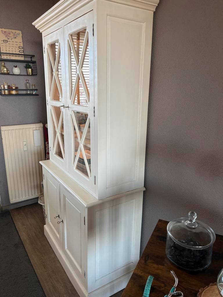 Mooie vitrinekast met verlichting. De kast bestaat uit twee delen. De afmetingen zijn: breedte bovenzijde 113 cm, hoogte totaal 210 cm. De kast is in goede staat, maar de binnenzijde heeft een likje v