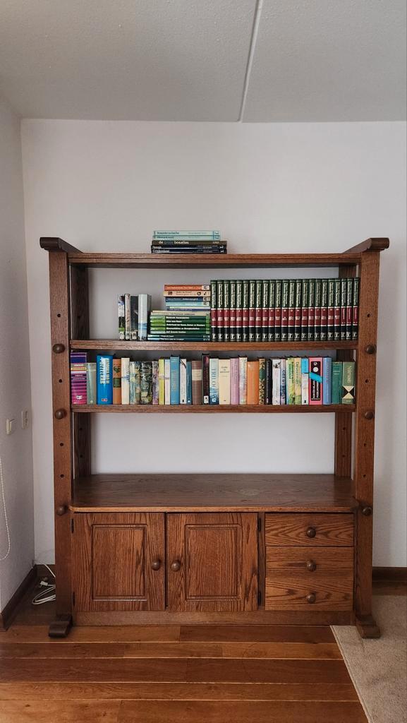 Mooie, stevige boekenkast of kaaskast gemaakt van eikenhout. De kast heeft zowel open planken als een afgesloten gedeelte met deuren en lades. Ideaal voor het opbergen van boeken, servies of andere sp