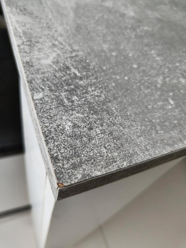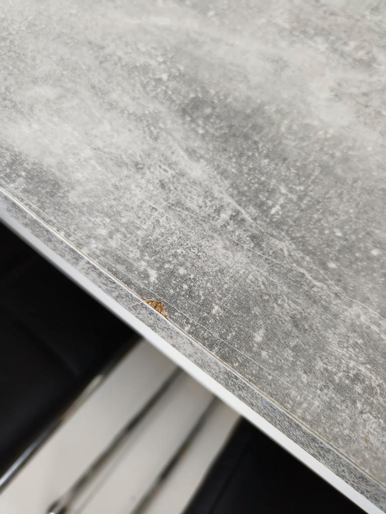 Grijs betonlook blad met witte poten. Biedt comfortabel plek aan 4 tot 6 personen. Afmetingen zijn 160 cm lang, 90 cm breed en 75 cm hoog. We verkopen de tafel omdat we een nieuwe hebben gekocht. De t