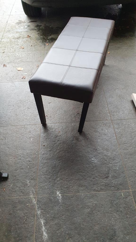 Een nette bruine bank. De bank is in goede staat en is gemaakt van kunstleer met houten poten. Perfect voor in de woonkamer of slaapkamer.
