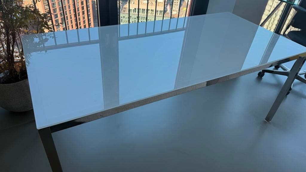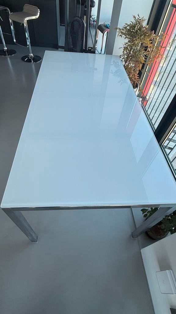 Stijlvolle ikea eettafel met een heldere glazen plaat en een modern chromen frame. De tafel is in goede staat en biedt ruimte voor zes personen. Ideaal voor een moderne inrichting. Afmetingen zijn180x