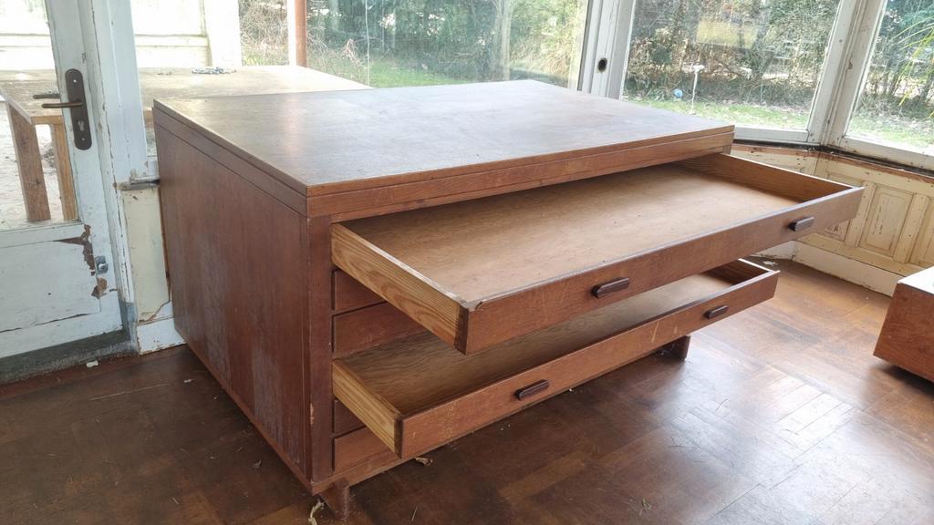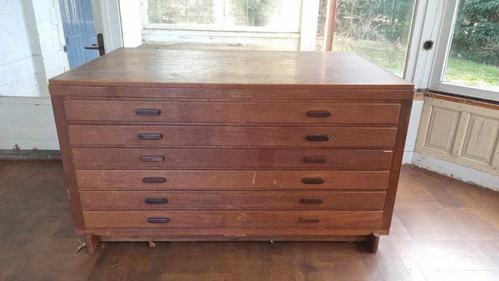 Mooie, massief houten tekeningenkast in a0 formaat. De kast is uit elkaar te halen en in delen te vervoeren. Houten verbinding (old school) ideaal voor het liggend bewaren van tekeningen. Afmetingen: