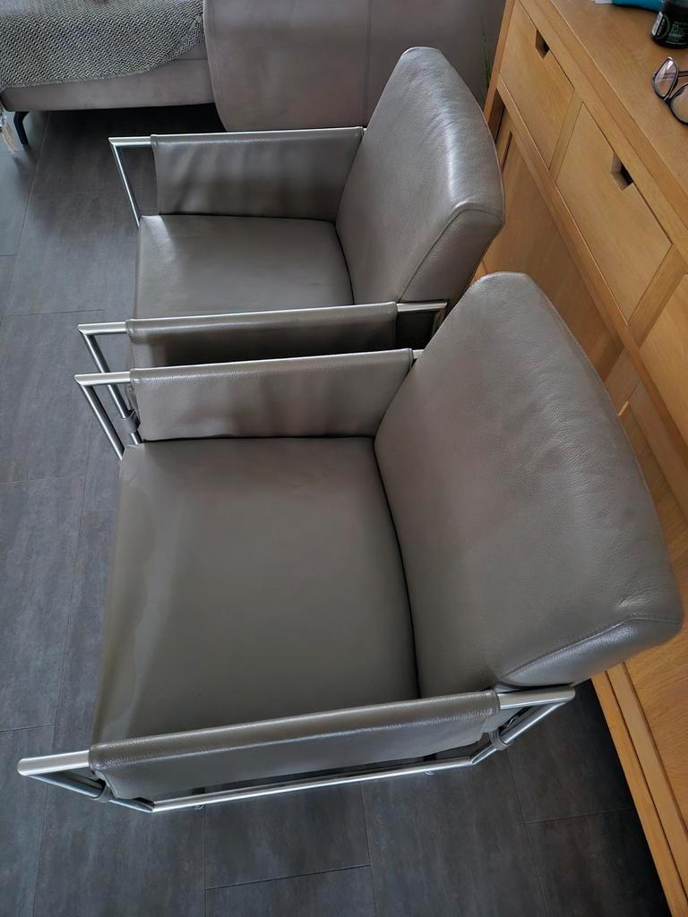 Stijlvolle leren stoel of fauteuil met een modern rvs frame. Comfortabel en in goede staat. Perfect voor in de woonkamer of op kantoor. Let op!!! Er is meer 1 stoel beschikbaar.