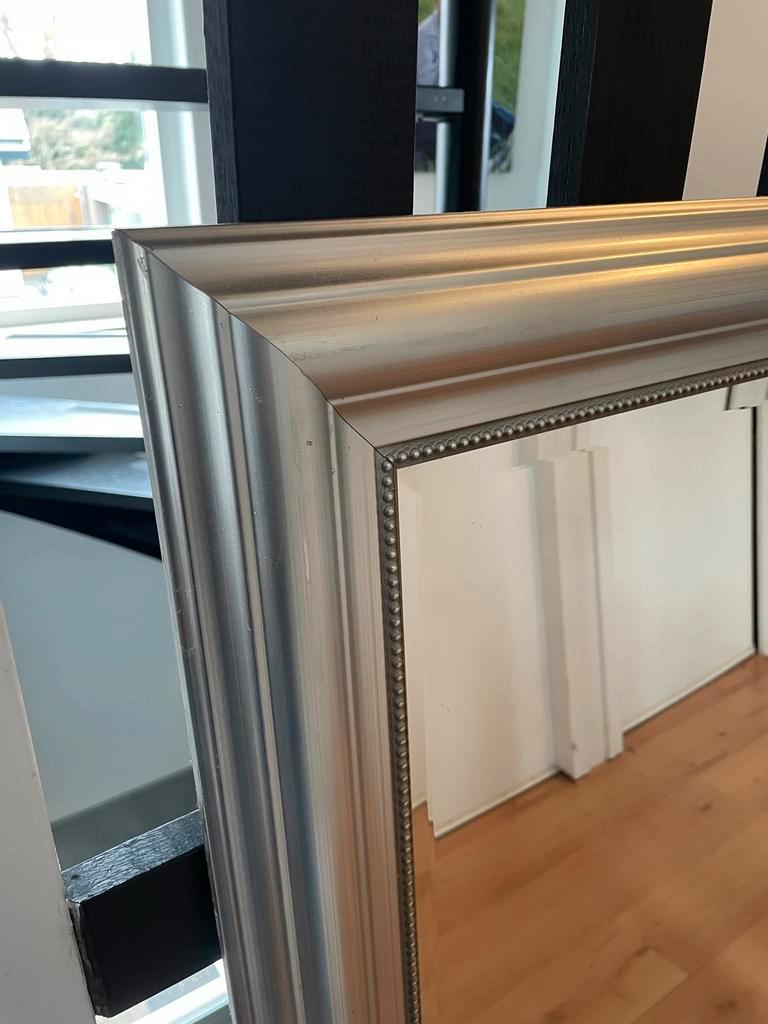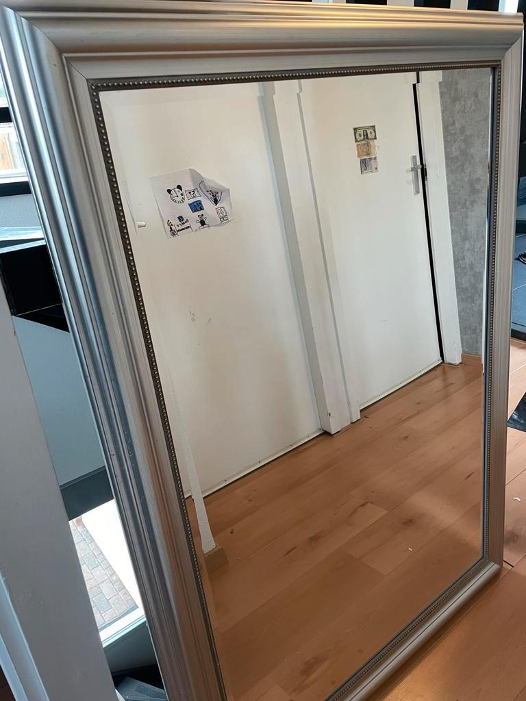 Mooie, grote rechthoekige spiegel met een elegante zilveren lijst. De spiegel is in gebruikte staat, maar nog steeds in goede conditie. Ideaal voor in de woonkamer, slaapkamer of hal. Afmetingen: zie
