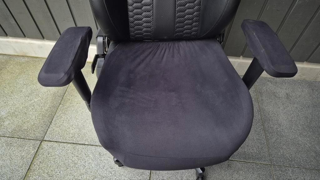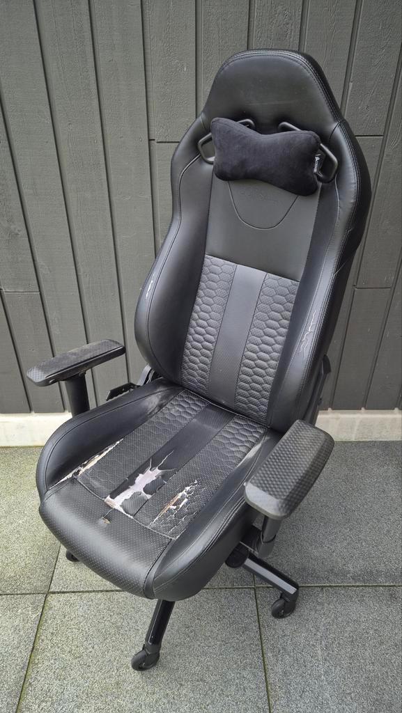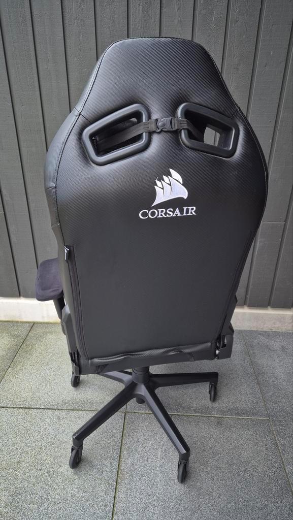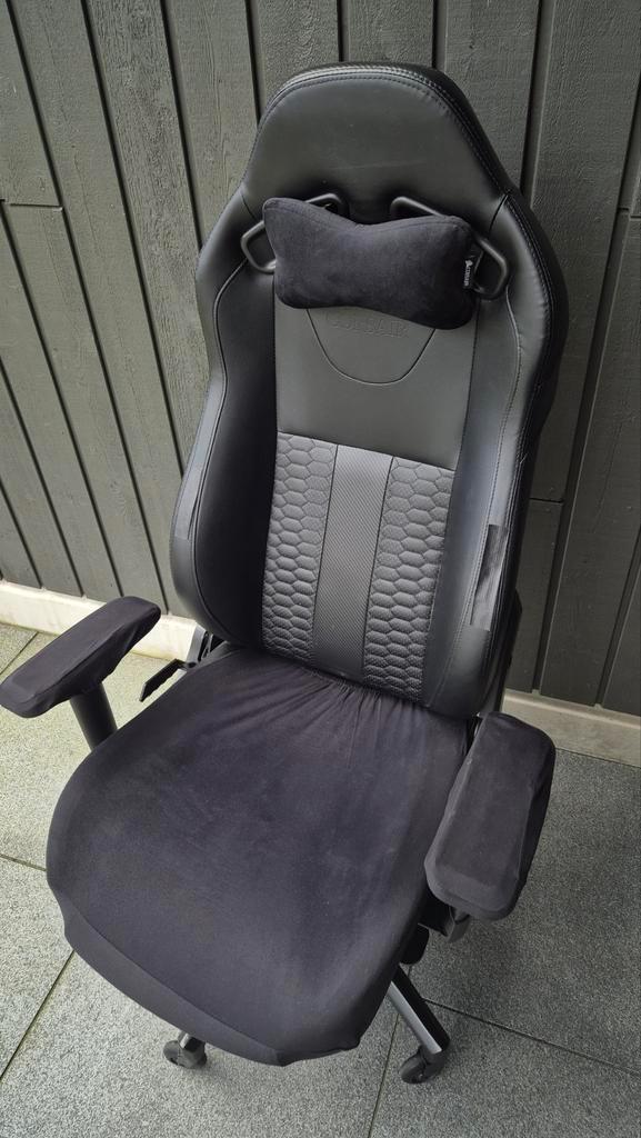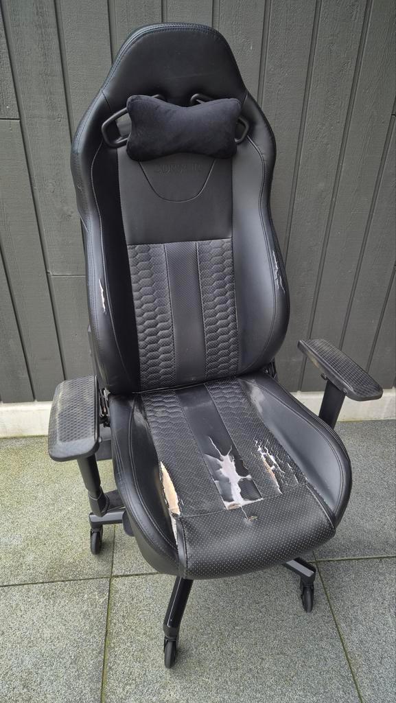 Gebruikte corsair gaming stoel. De stoel is nog functioneel, maar vertoont duidelijke gebruikssporen. Zie foto''s voor details. Vorig jaar hebben we de stoel opgeknapt met hoesjes en plak-nep-leer.