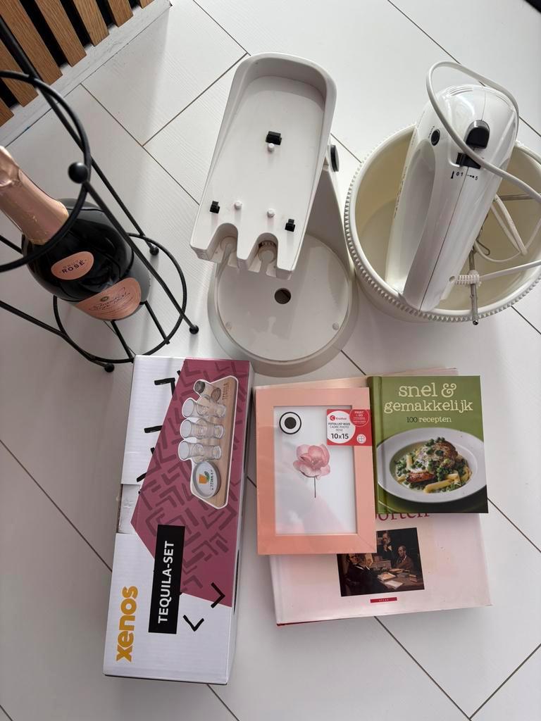 Ouderwetse mixer dik boek over vogels fles rose met bubbels (dicht) tequila set (nieuw) toilet papier houder fotolijstje (nieuw) boekje met recepten liefst alles in 1 x