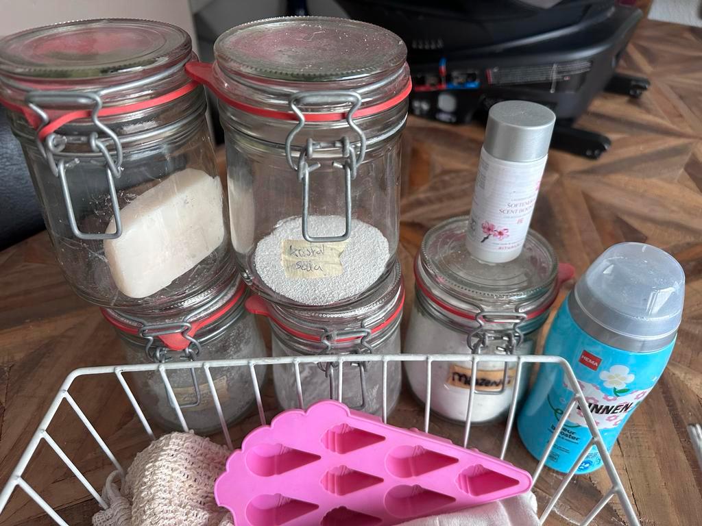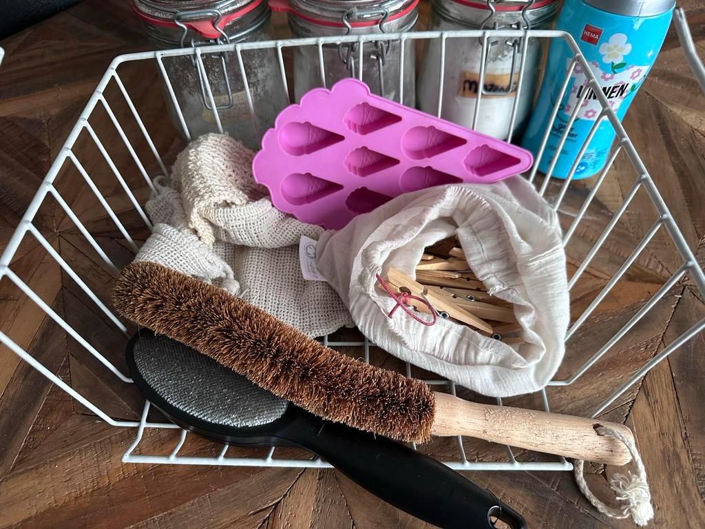 Een diverse verzameling huishoudelijke artikelen, waaronder glazen potten, mattenklopper, een siliconen ijsvorm, schoonmaakborstels, wasknijpers en andere handige items. Ideaal voor een milieubewuste