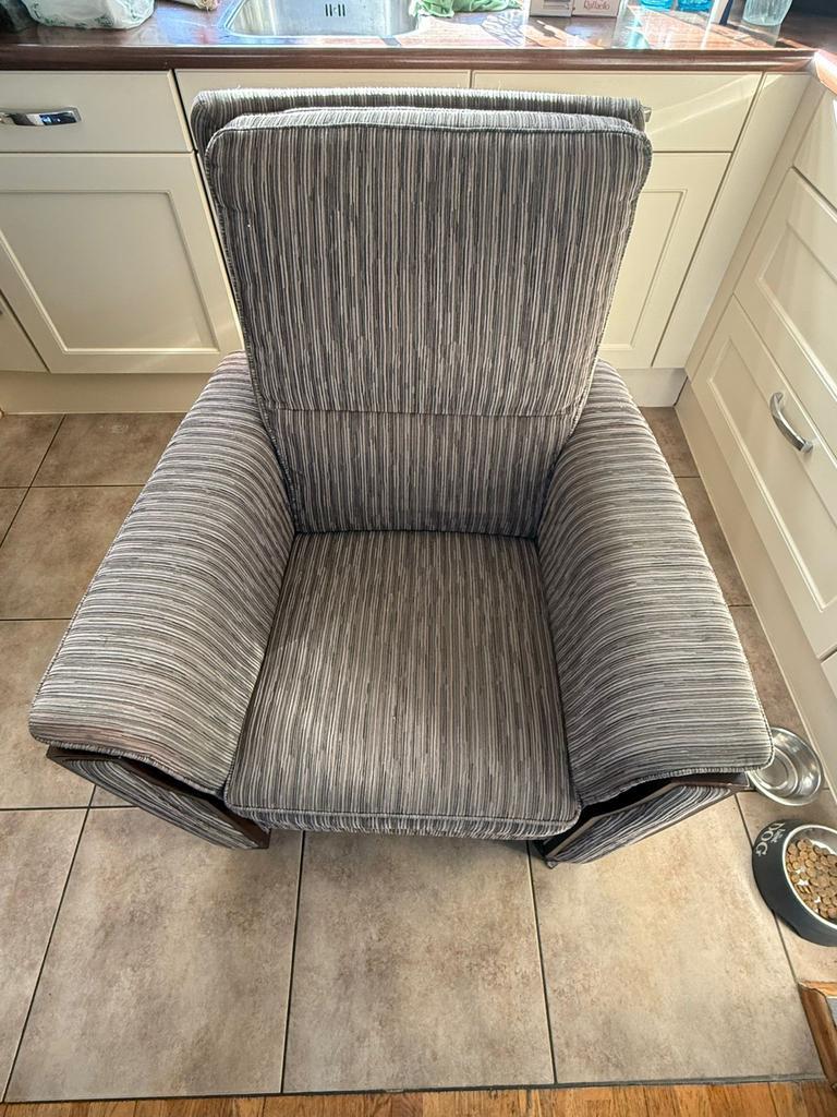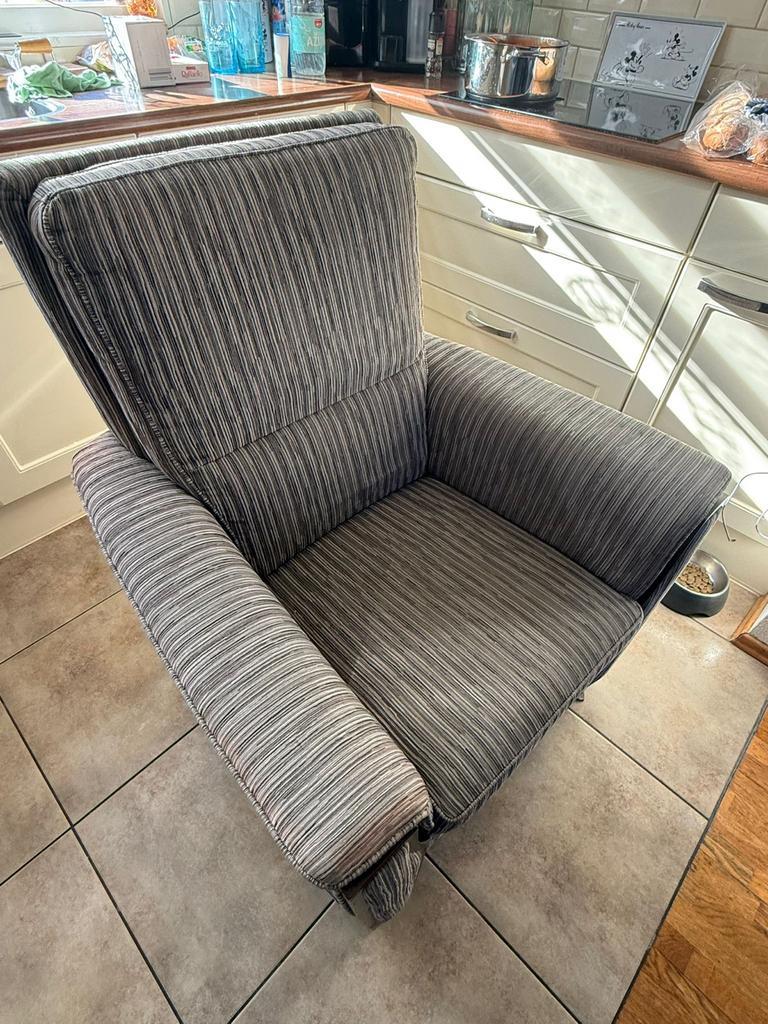 Degelijke fauteuil van het merk 3b. De stoel is grijs gemêleerd en heeft een verstelbare zitting voor optimaal comfort. Let op: op de leuning is een lichte roze/rode verkleuring zichtbaar (zie foto).