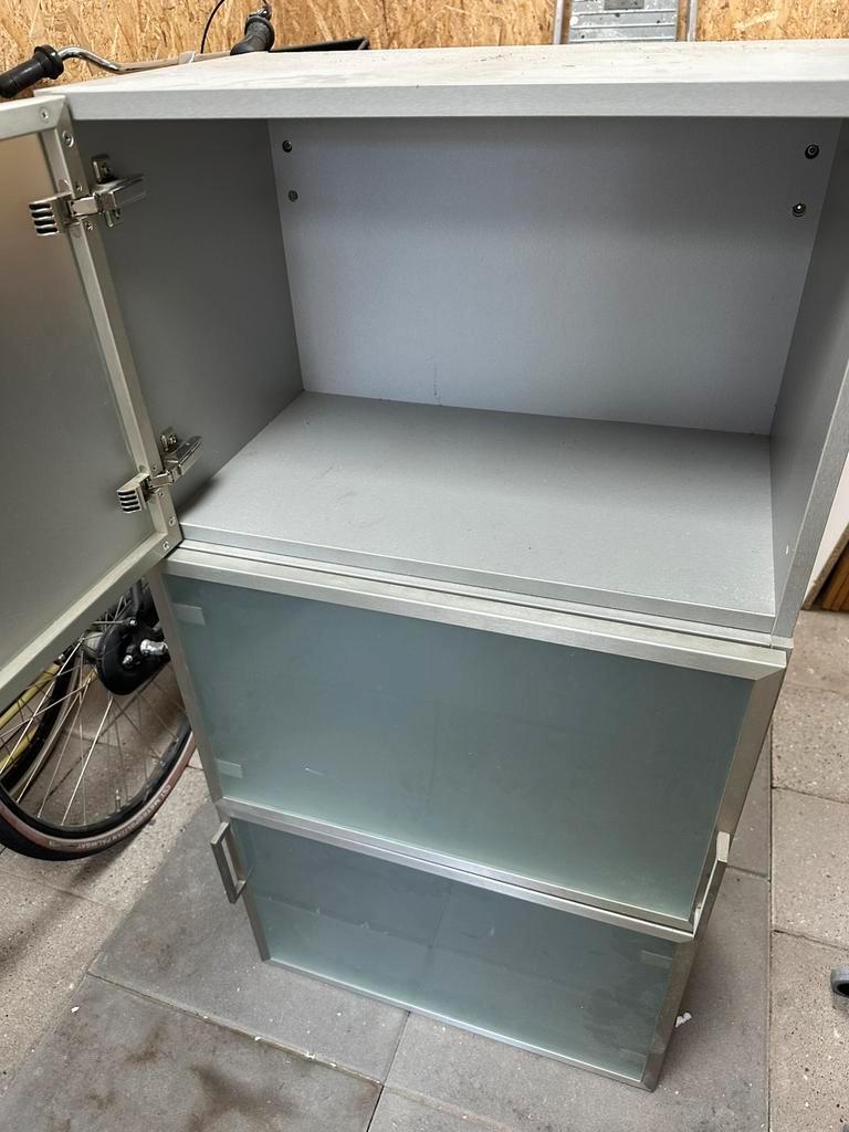 Gratis afhalen, 3 bovenkastjes afm. 60X37,5x39 cm (breedte x diepte x hoogte) met glazen deurtjes v.v. Rvs rand handig voor in de schuur of garage!