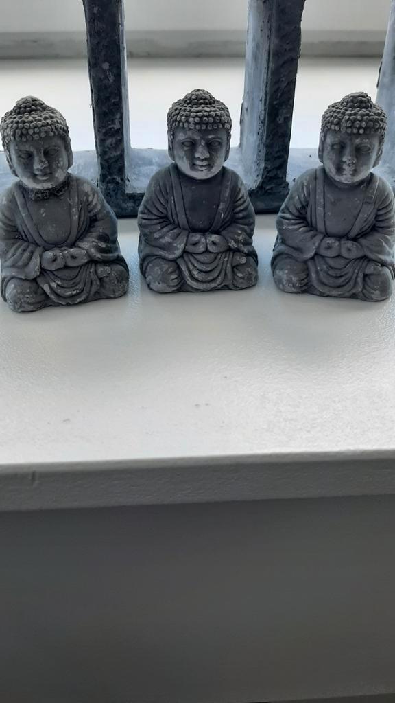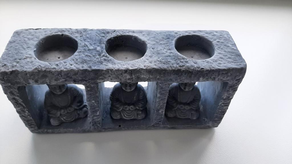Mooie waxinelichthouder met drie boeddhabeeldjes. Geschikt voor waxinelichtjes of kleine kaarsjes. In goede staat.