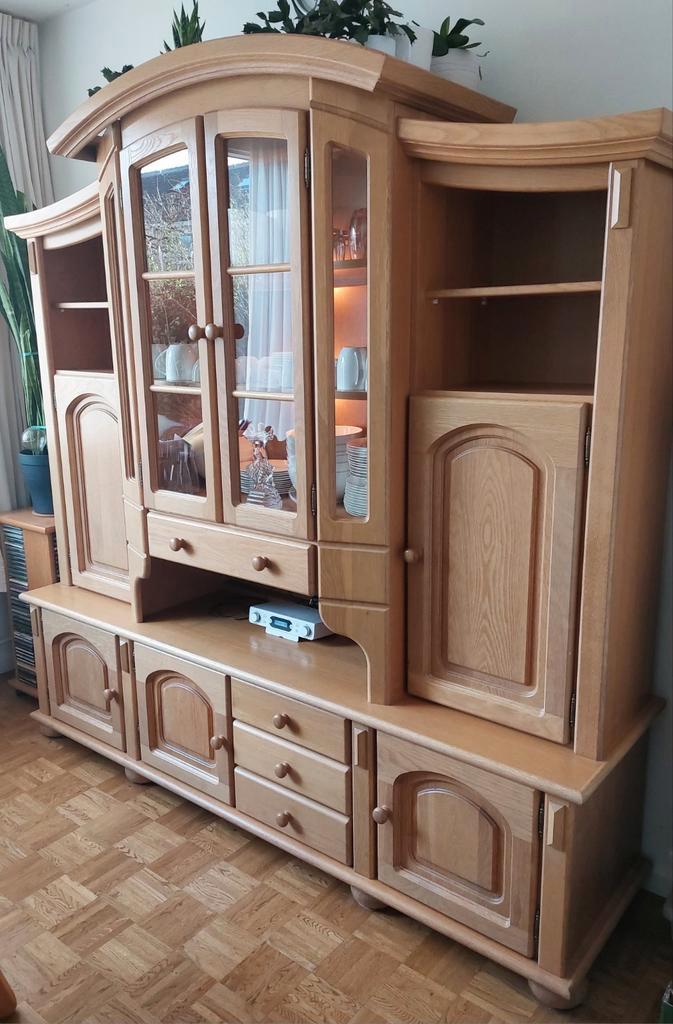 Ruim en elegant blank eiken wandmeubel, inclusief verlichtingsoptie. Afmetingen: 255 cm breed, 257 cm hoog en 53 cm diep. Ideaal voor het opbergen en presenteren van uw spullen. Met diverse lades, deu
