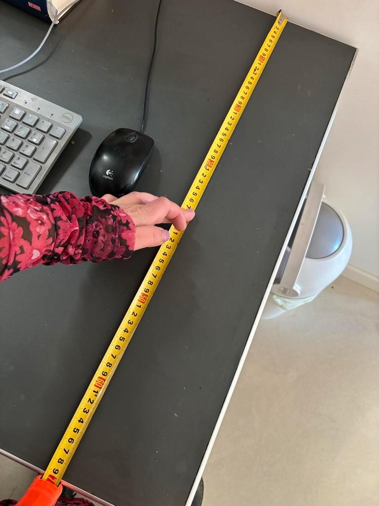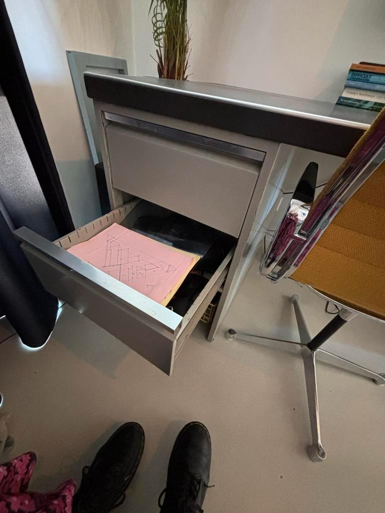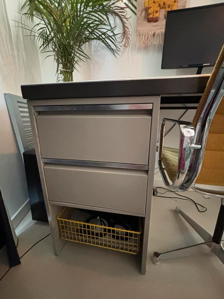 Stoer en stevig stalen bureau, ideaal voor thuiswerken of studeren. Het bureau is 70 cm breed, 134 cm lang en 76 cm hoog. Het ladeblok kan eventueel losgehaald worden voor transport. Gratis af te hale