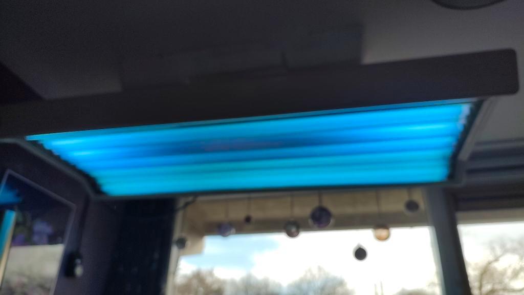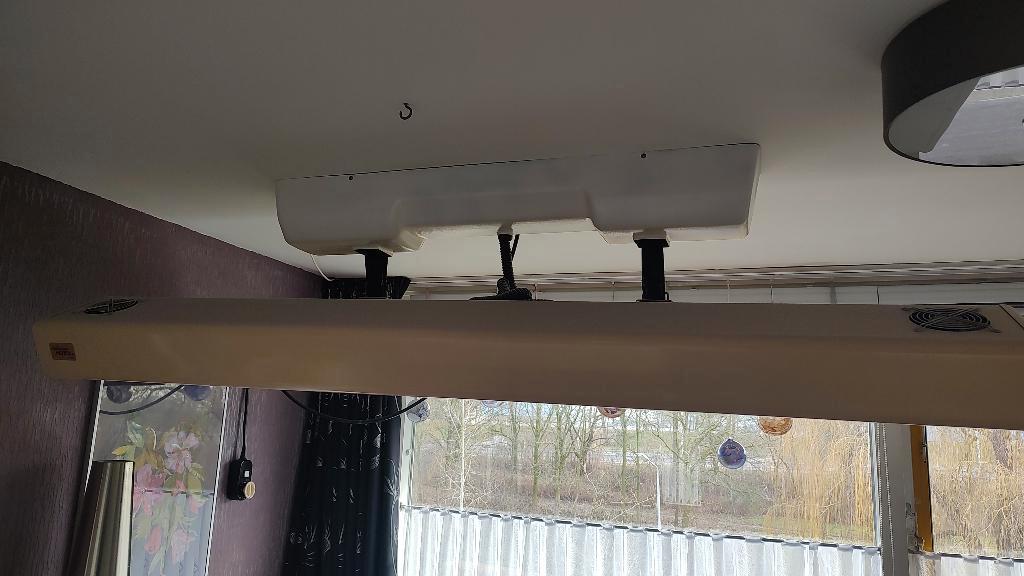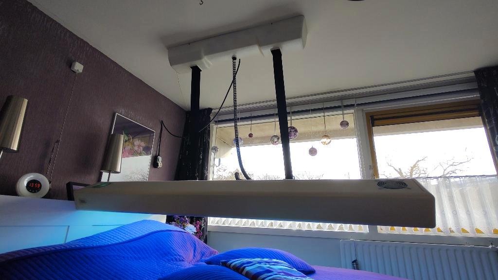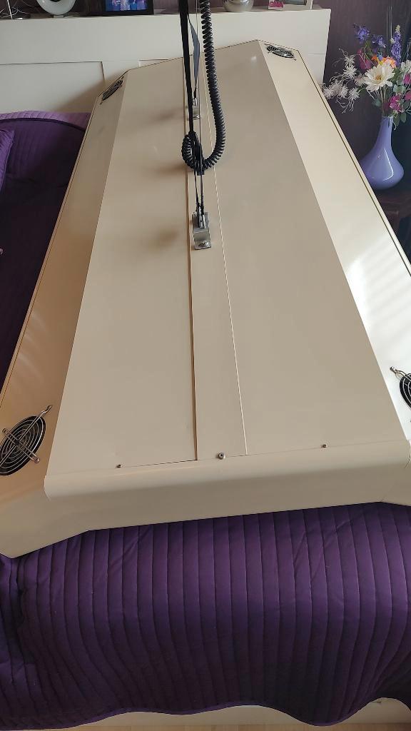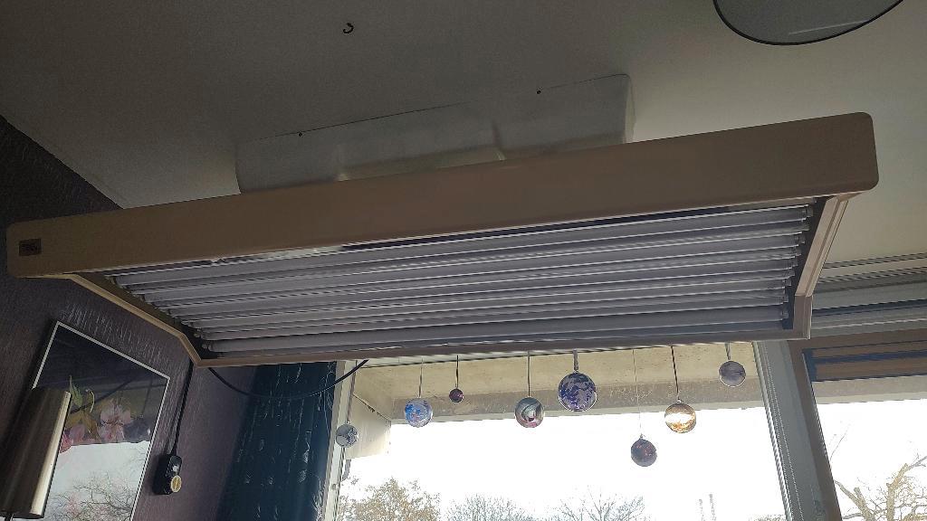 Zonnehemel met 12 buizen van 100 watt. Monteren aan het plafond. Elektrisch in hoogte te verstellen en met timer waarmee je de tijd kunt instellen zodat de zonnebank automatisch uitschakelt. Alles wer