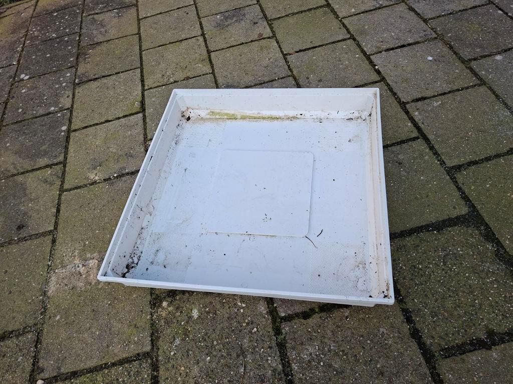 Witte lekbak voor onder een wasmachine of droger. De bak is gebruikt, maar in goede staat. Het is een handige manier om water op te vangen bij lekkage en schade aan de vloer te voorkomen.