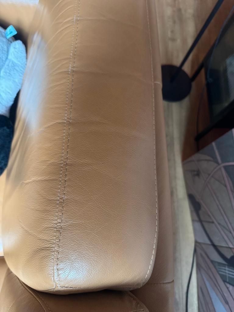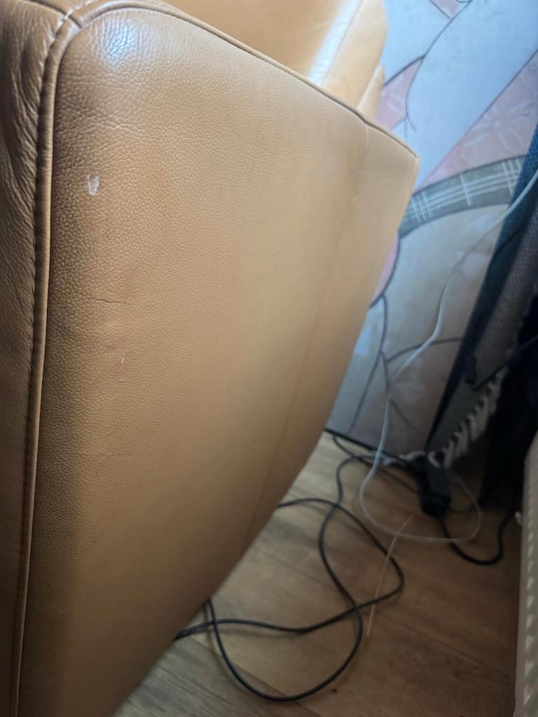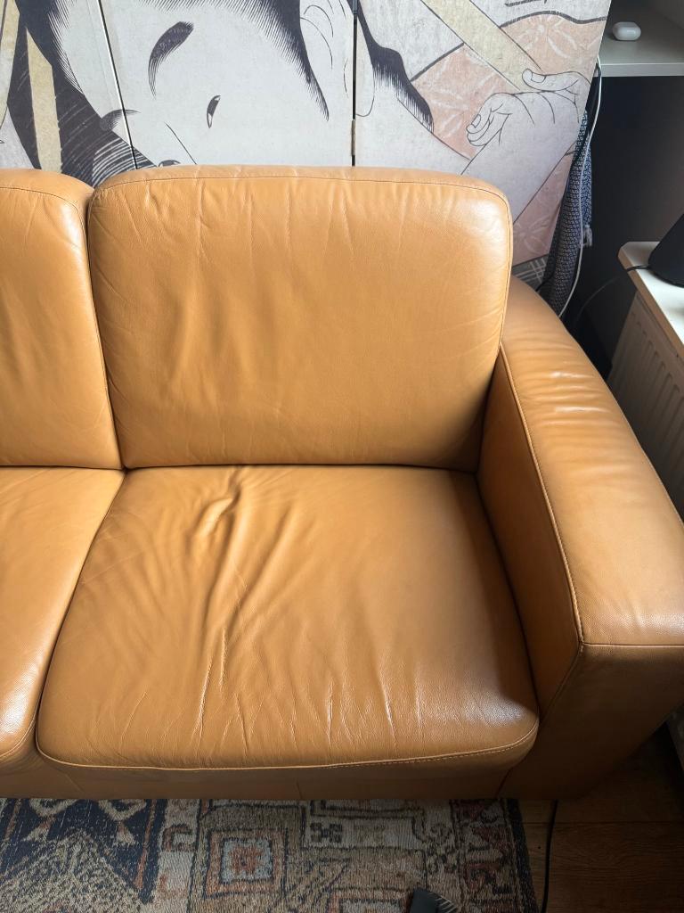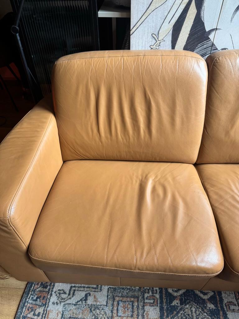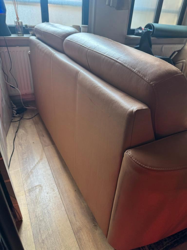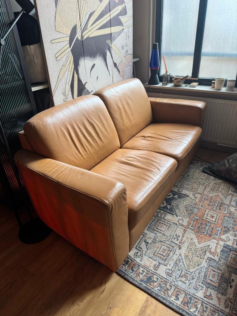 Okergele lederen 2.5 Zits bank van circa 180cm lang, 90cm diep en 90cm hoog. Kan opgehaald worden op begane grond maar moet wel door een raam getild worden daarna prima te tillen met 2 personen. Zit e