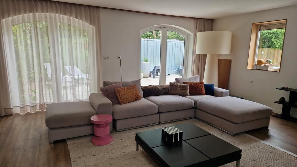 Zandkleurige elementenbank, in diverse opstellingen neer te zetten. Er hoort nog 1 kussen bij maar dat staat niet op de foto. Elementen zijn ong 85 cm breed en 100 cm diep. Bank kan ook in l opstellin