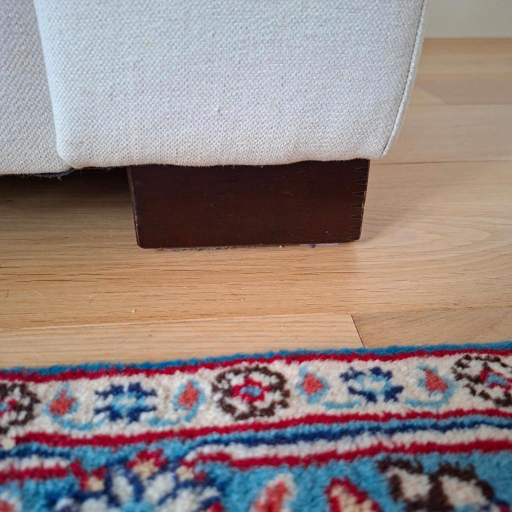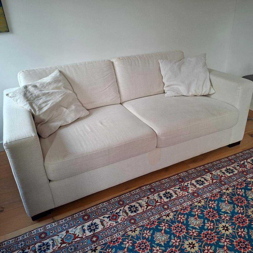 Ruime tweezits. Zit lekker! 180 Breed 95 diep 60 armhoogte 75 rughoogte donkerhouten blokpootjes hoezen met rits, kunnen afgehaald en gewassen.