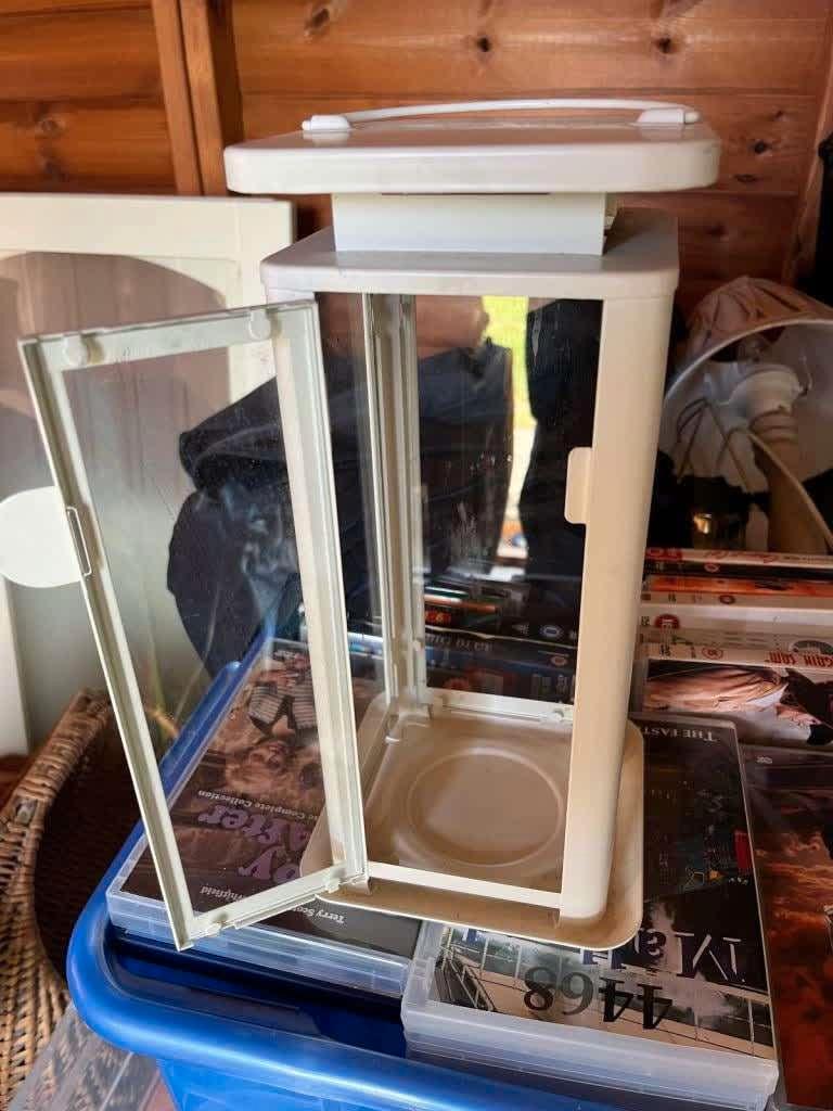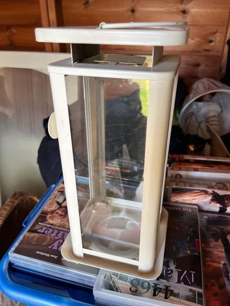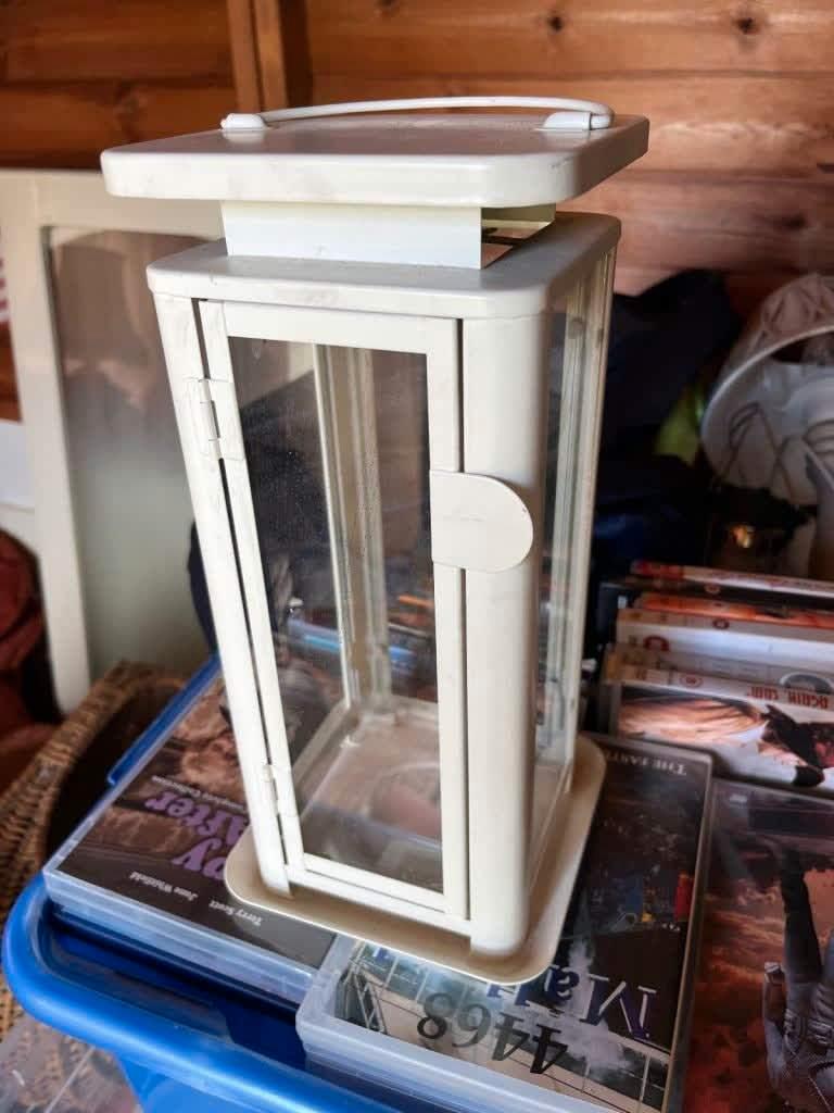 Hallo, ik verkoop deze mooie, originele kandelaar van metaal met glazen panelen en crèmekleurige afwerking... Ziet er prachtig uit als decoratie. Hoogte ongeveer 35 cm, breedte aan de bovenkant 10 cm.