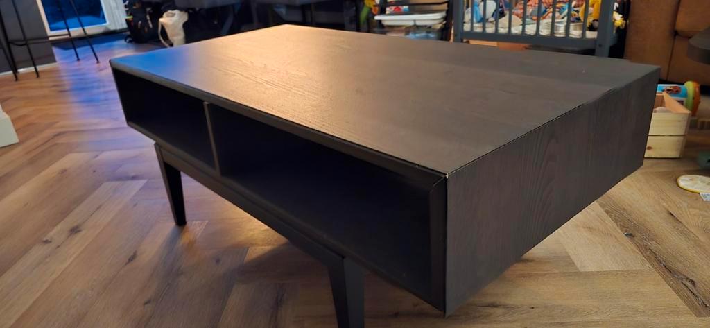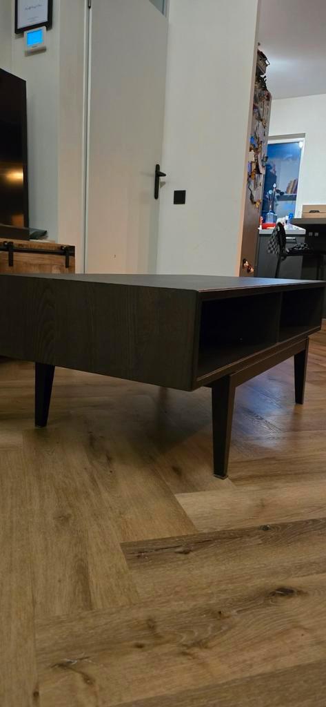 Mooie salontafel met een donker hout motief. De tafel is stevig en in aardig goede staat. Perfect voor in de woonkamer. Heeft twee ruime opbergvakken onder het blad zitten. Mag weg voor een niks, dan