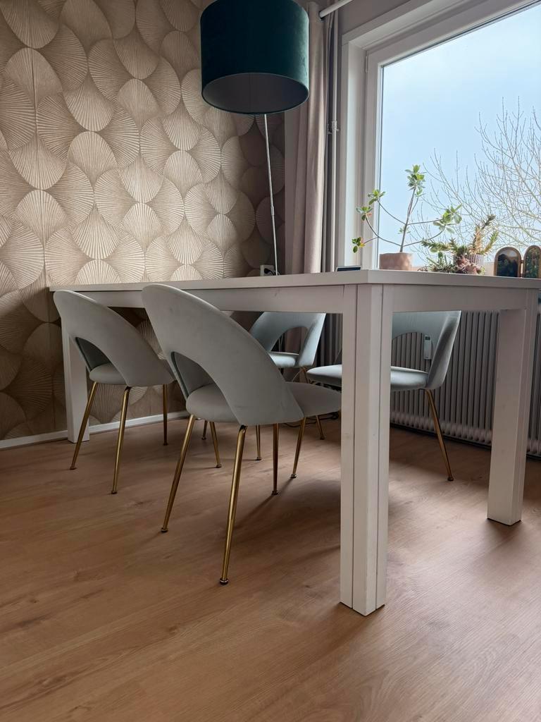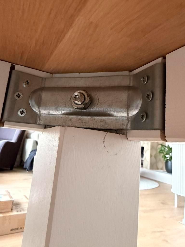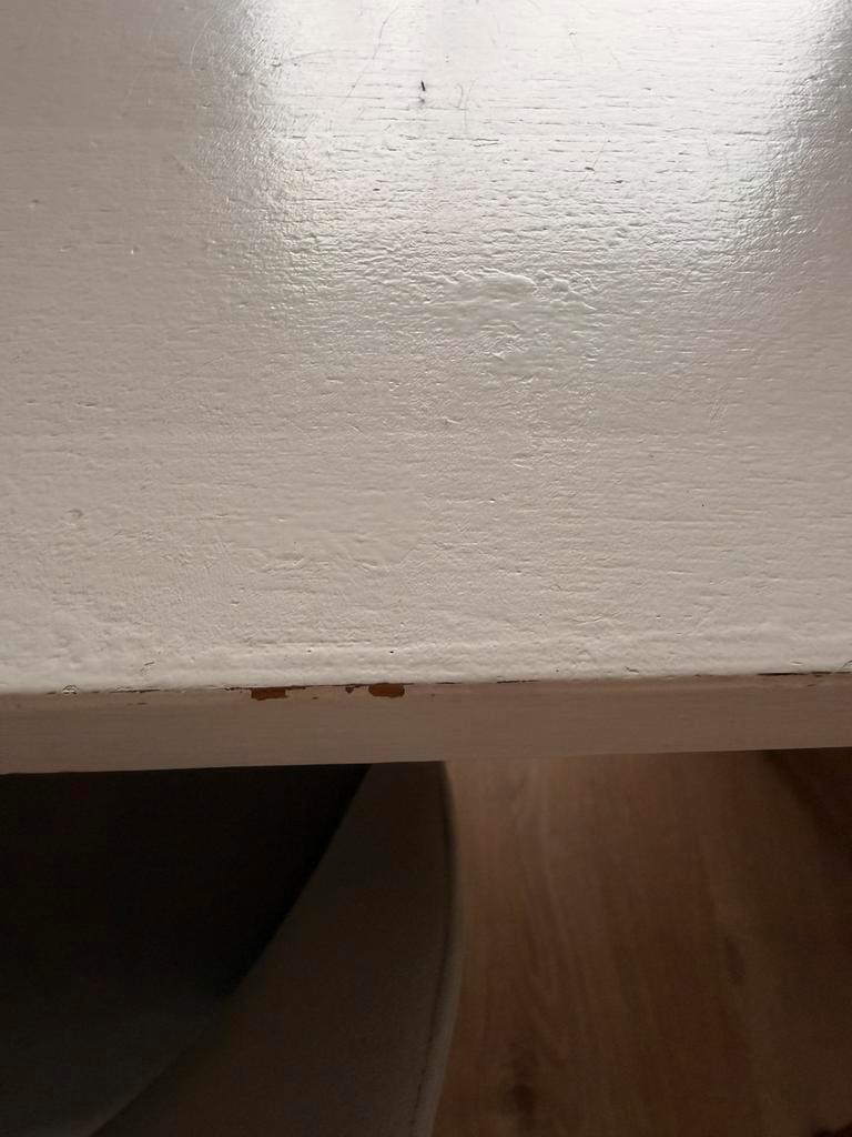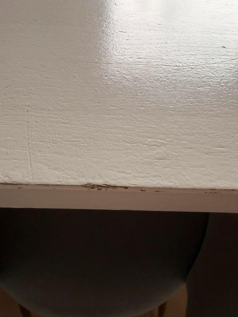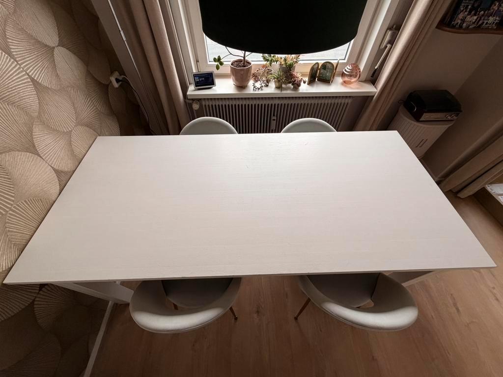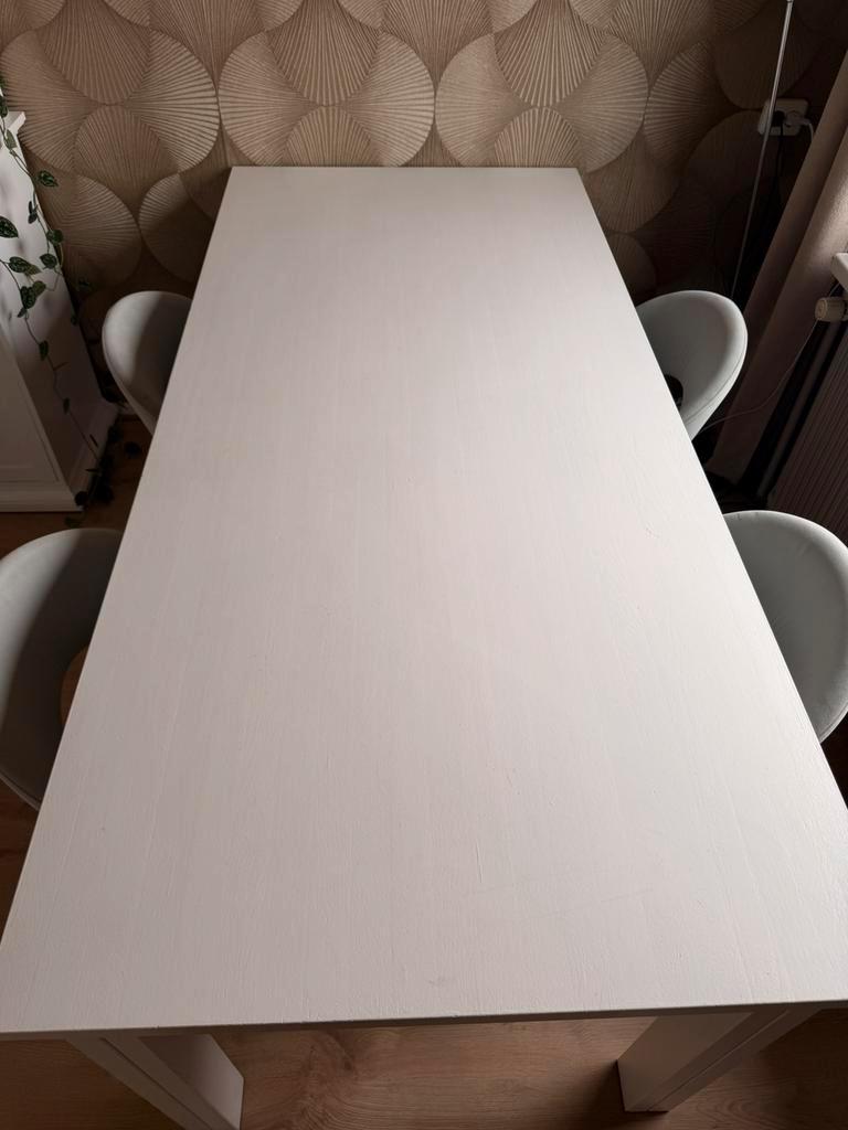 Witte stevige houten tafel, kleine gebruikerssporen aan rand tafel, zie foto. 1 Poot van de tafel is extra verstevigd met 2 schroeven, zie foto. Poten zijn los te schroeven voor vervoer. 200 Cm lang 9