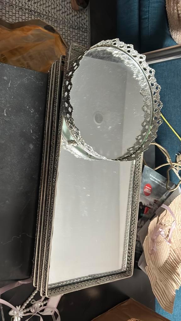 Vier rechthoekige dienbladen en een rond dienblad met een spiegel binnenkant bij alle vijf gratis afhalen in goede staat