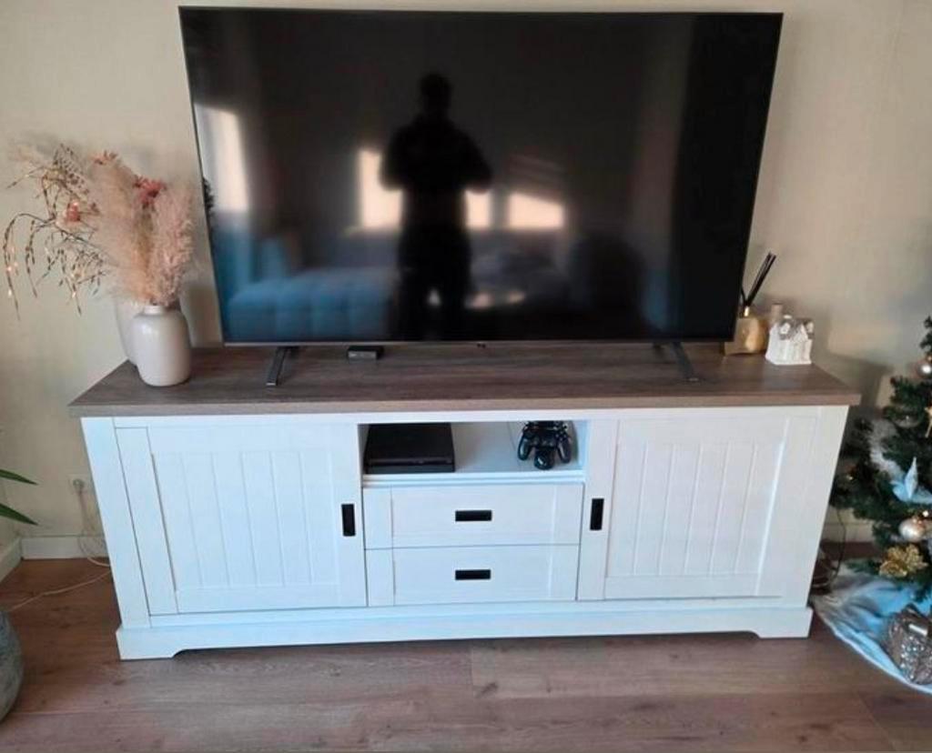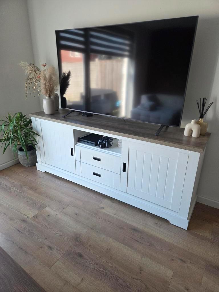 Mooi tv meubel met veel opbergruimte. Het meubel is in goede staat en heeft een moderne uitstraling. Ideaal voor het plaatsen van een tv en andere multimedia apparatuur. Afmetingen zijn: breedte 214 c