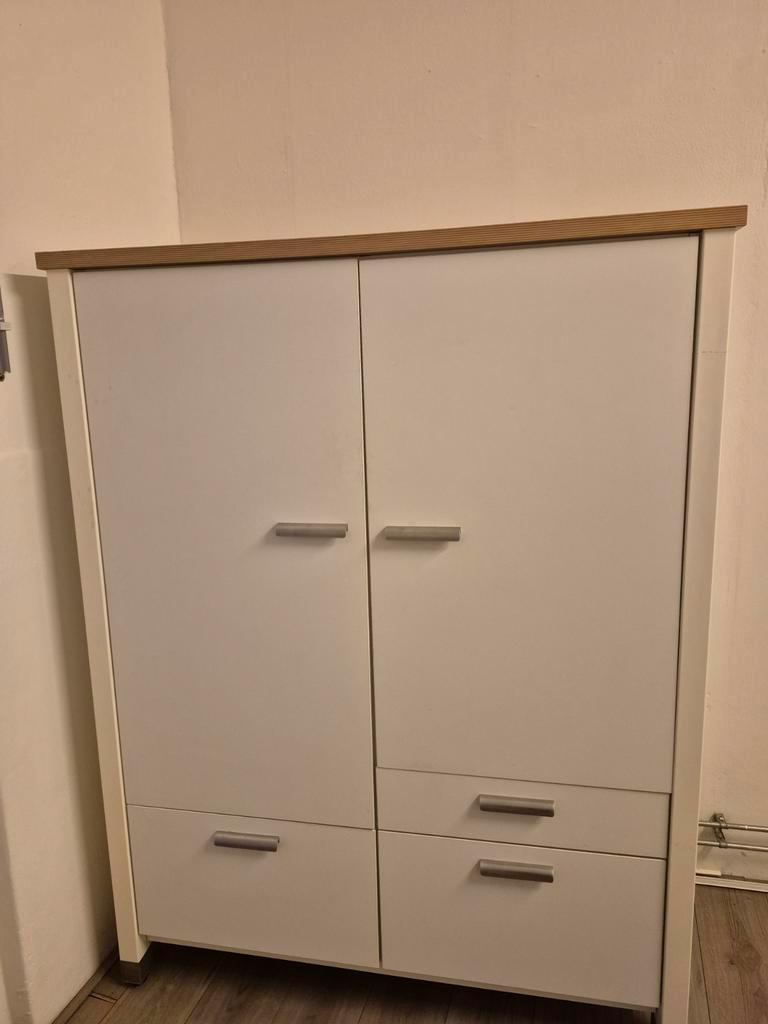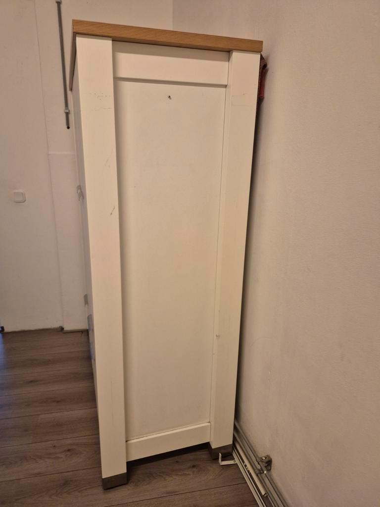 Mooie witte kast met houten bovenblad. De kast heeft twee deuren en drie lades. Ideaal voor het opbergen van kleding of andere spullen. De kast is in goede staat. Gratis op te halen in nijmegen voor e
