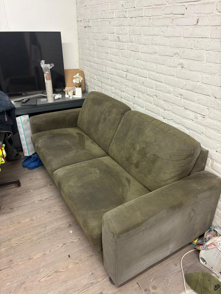 Nette groene leren bank moet weg, kan mee voor 2 kratjes bier maten 194cm x 86cm