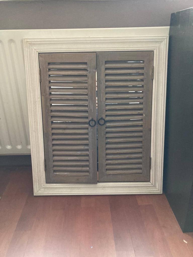 Spiegel met houten luikjes. De luikjes kunnen open en dicht, waardoor je met de lichtinval kunt spelen. In goede staat.