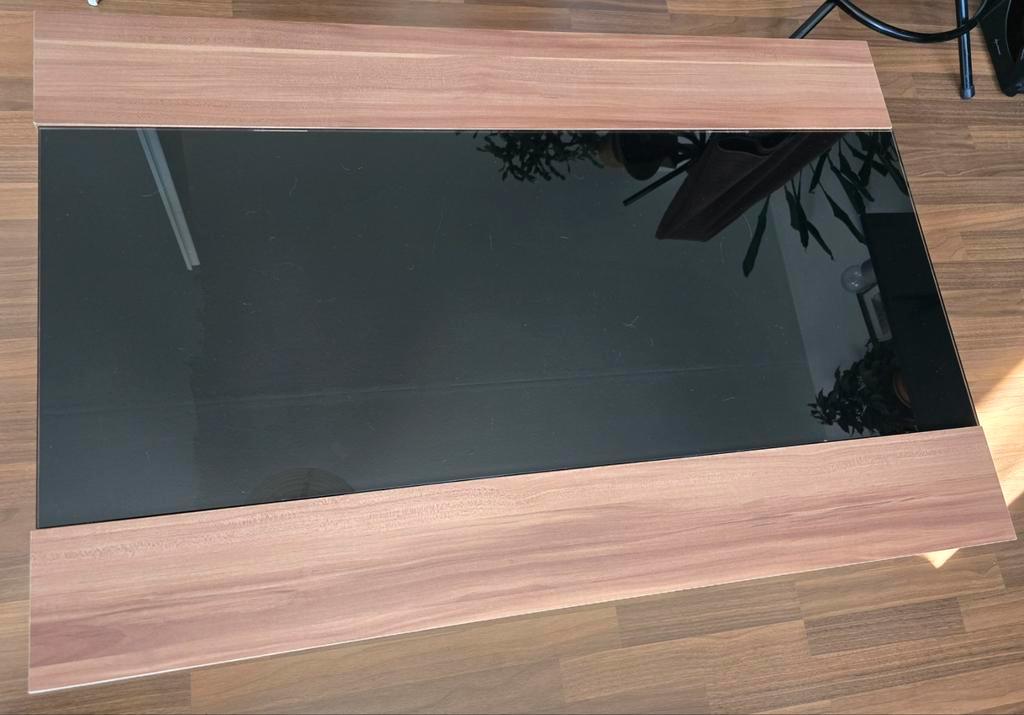 Stijlvolle tafel met een zwart glazen blad. De afmetingen zijn 107 cm lang, 70 cm breed en 45 cm hoog. Perfect als salontafel of bijzettafel. Het zwarte glas geeft een moderne uitstraling. Zijn klein
