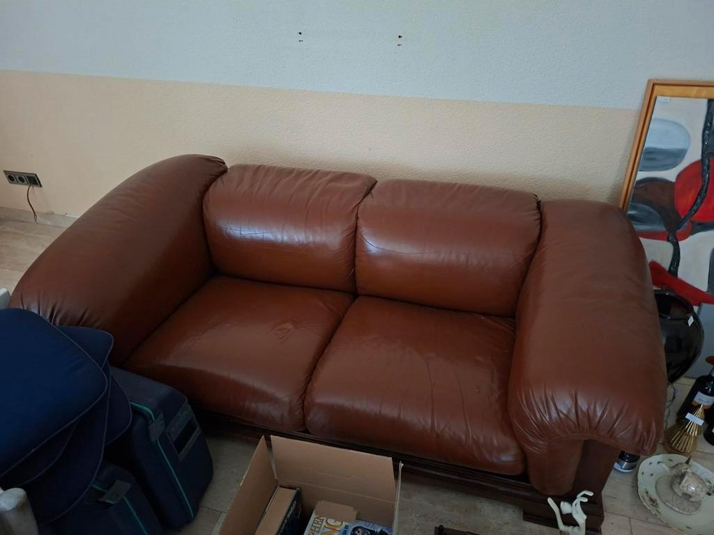 Comfortabele bruine lederen tweezitsbank. De bank is in goede staat en heeft een klassieke uitstraling. Perfect voor een gezellige zithoek. Afmetingen: geschikt voor twee personen. Materiaal: leder en