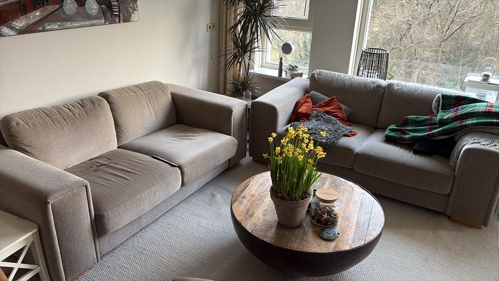 Twee comfortabele tweezitsbanken in een neutrale beige kleur. Beide banken zijn 190 cm breed en 90 cm diep. Ze zijn ideaal voor een kleinere woonkamer of als extra zitplaatsen. De banken zijn in goede
