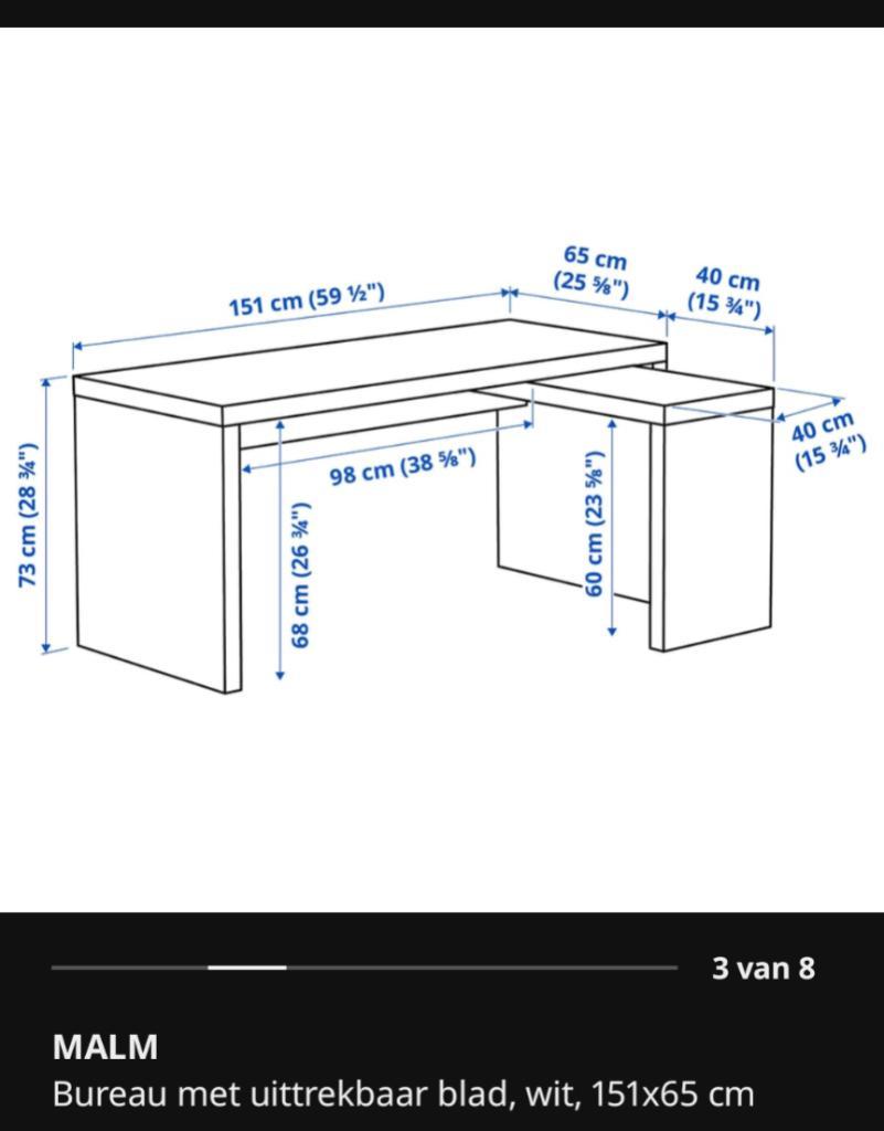 Malm bureau met uittrekbaar blad, wit - ikea afmetingen 151x65 (105) cm zie afbeelding voor alle detail afmetingen bureau heeft wat schade, vandaar gratis op te halen. Ophalen in vlaardingen