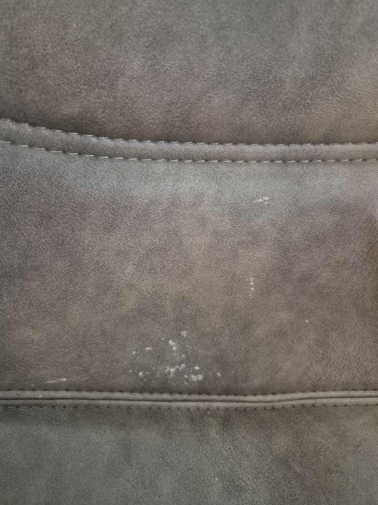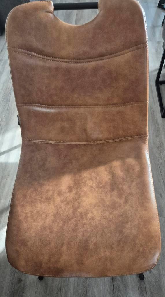 6 eetkamer stoelen. 3 Kleuren, cognac grijs en groen. Stoelen zijn goed. Kunstleer heeft wat beschadigingen, zie foto''s. Totale hoogte 90 cm zithoogte 45 cm breedte 46 cm zitdiepte 44 cm