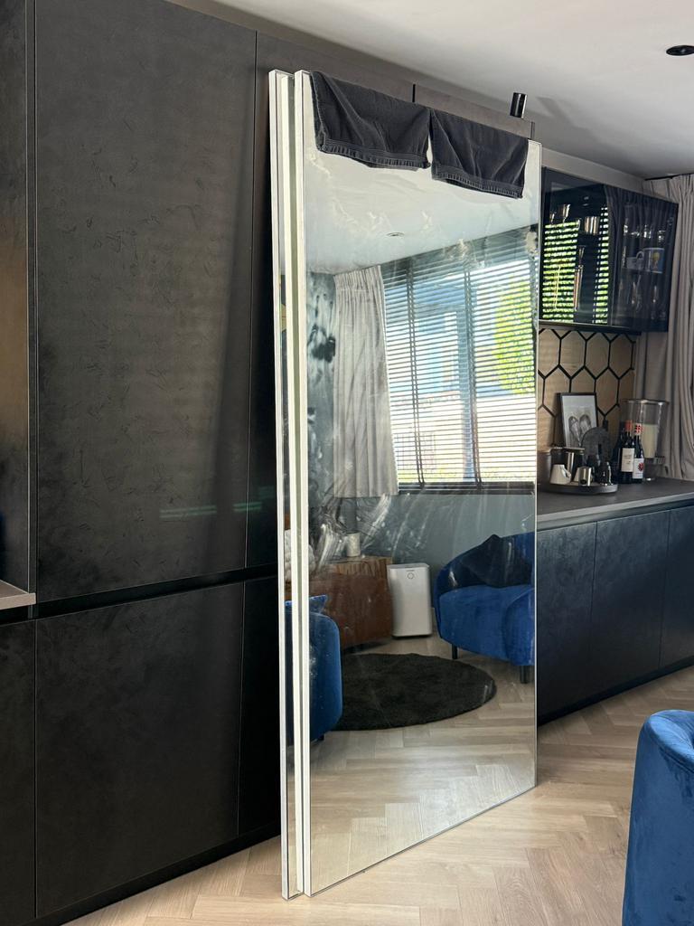 2 grote mooie spiegels spiegel 1: 106 breed, 223 hoog, 2,5 diep spiegel 2: 111 breed, 223 hoog, 4 diep (houten latten die evt verwijderd kunnen worden) topzwaar! Met minimaal 2 sterke mannen op komen