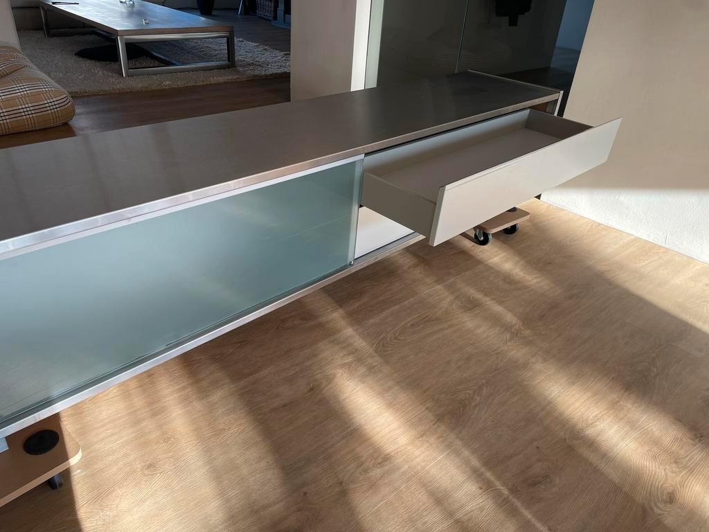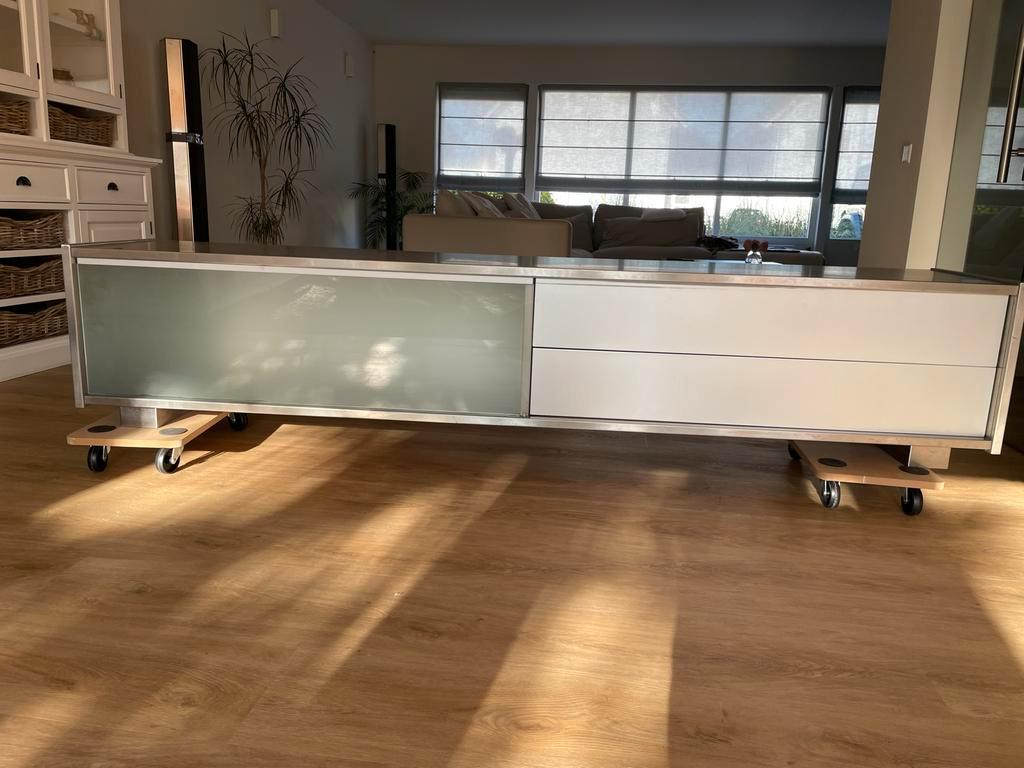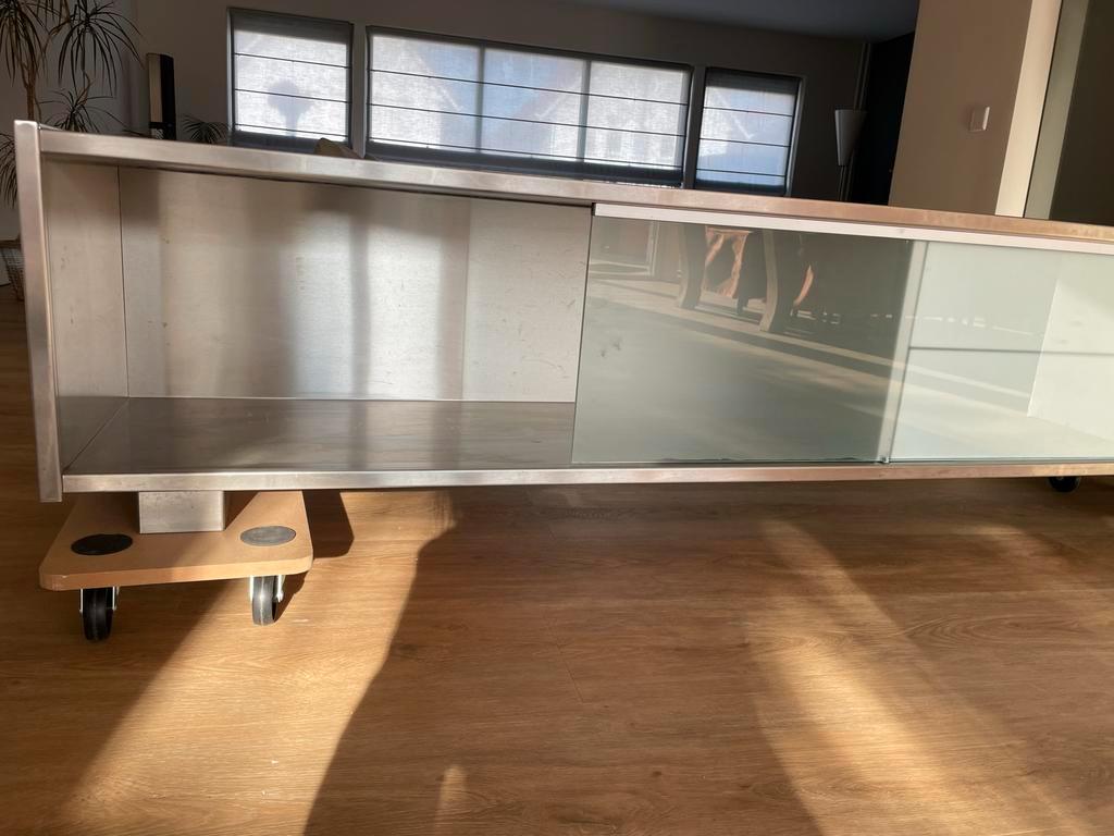 Strakke, lage kast van roestvrij staal (rvs). Ideaal als tv-meubel of dressoir. Voorzien van schuifdeur en lades. Afmetingen hoogte 48 cm,diepte 45 cm,lengte 2,34 cm