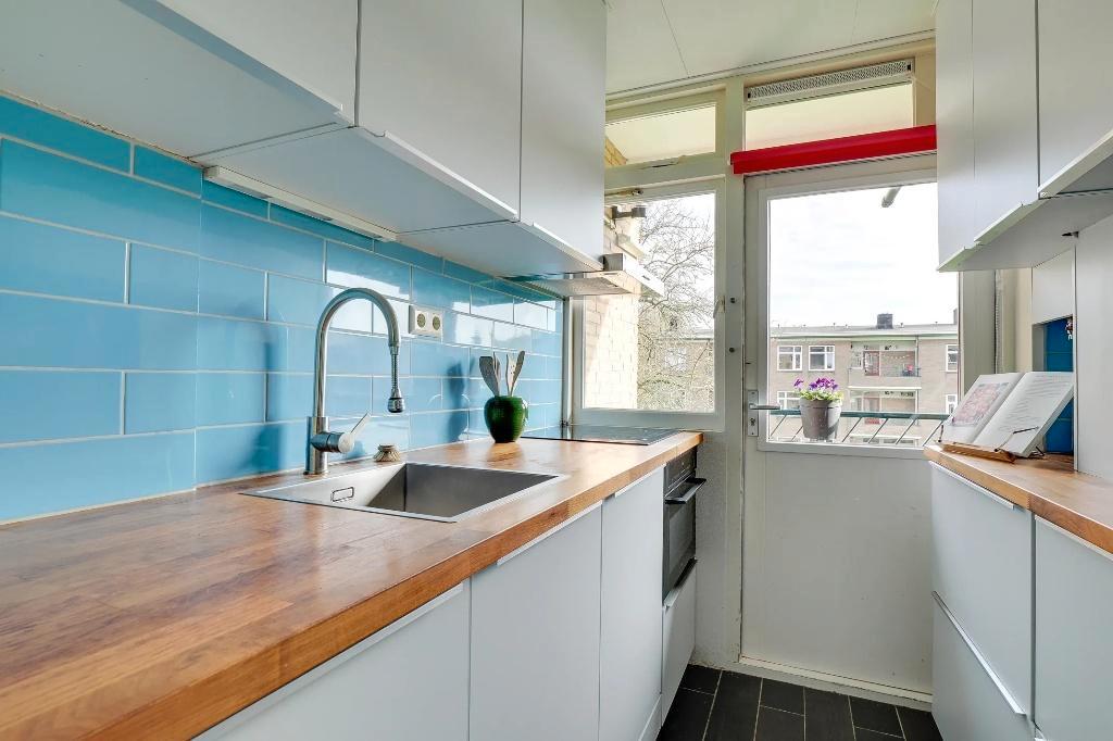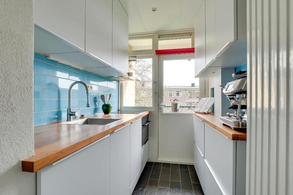 Klein, maar fijne gebruikte keuken. Ondanks dat de keuken klein is, is deze heel efficiënt ingedeeld en heb je veel opbergruimte. Aan de linkerzijde is een tafelmodel koelkast, vaatwasser van bosch, o