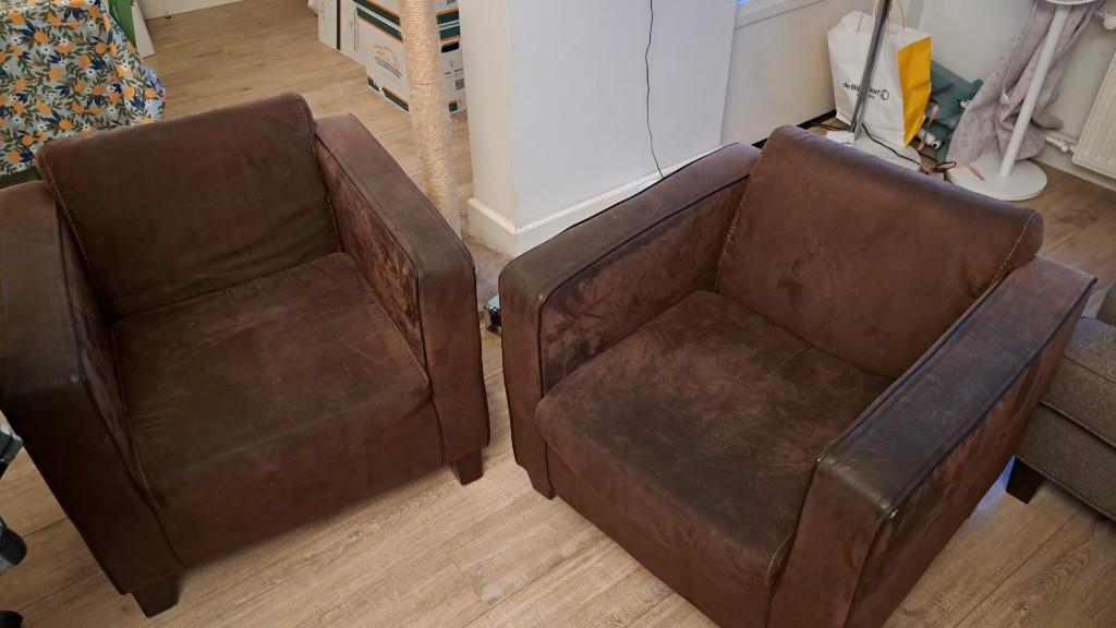 Twee comfortabele bruine fauteuils in goede staat.